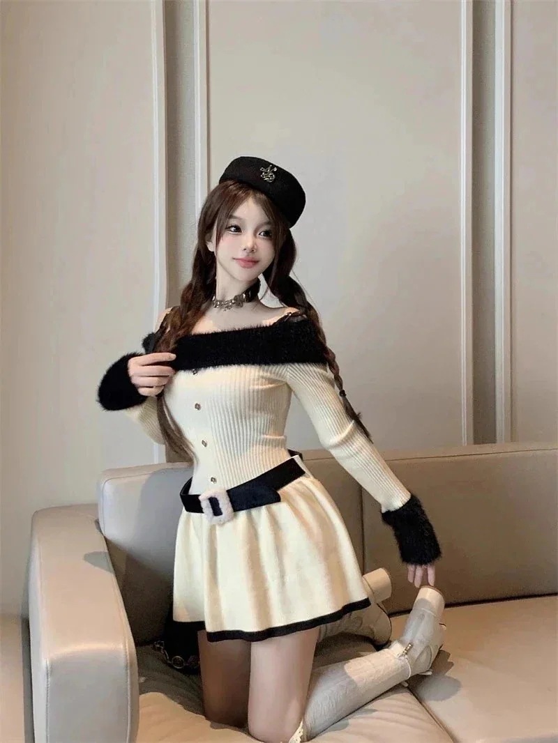 ニット 長袖ニットワンピース一字肩a字スカート