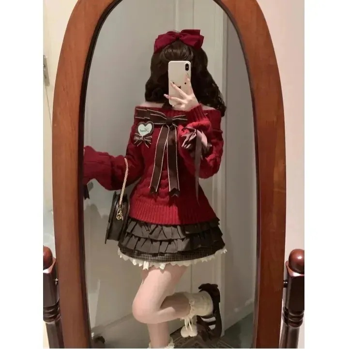 25 サンタコスプレ2点セット キュート レッド セットアップ 蝶結び ニット セーター 可愛い クリスマス衣装 サンタコス
