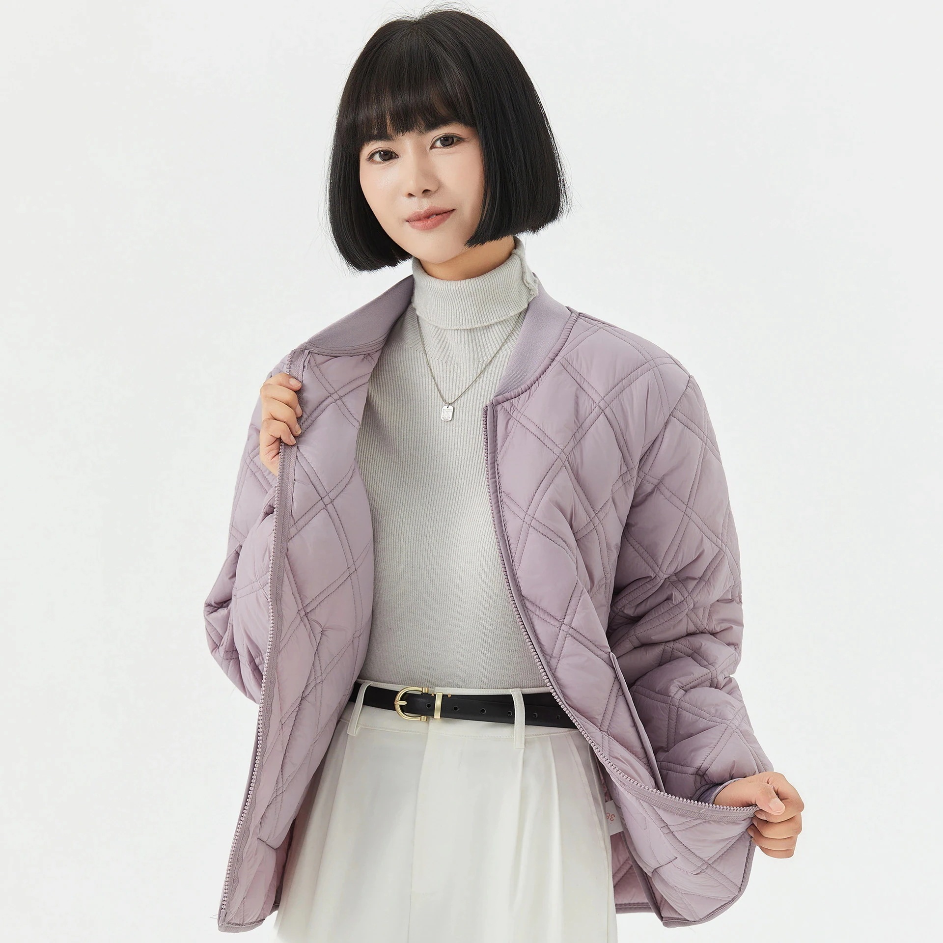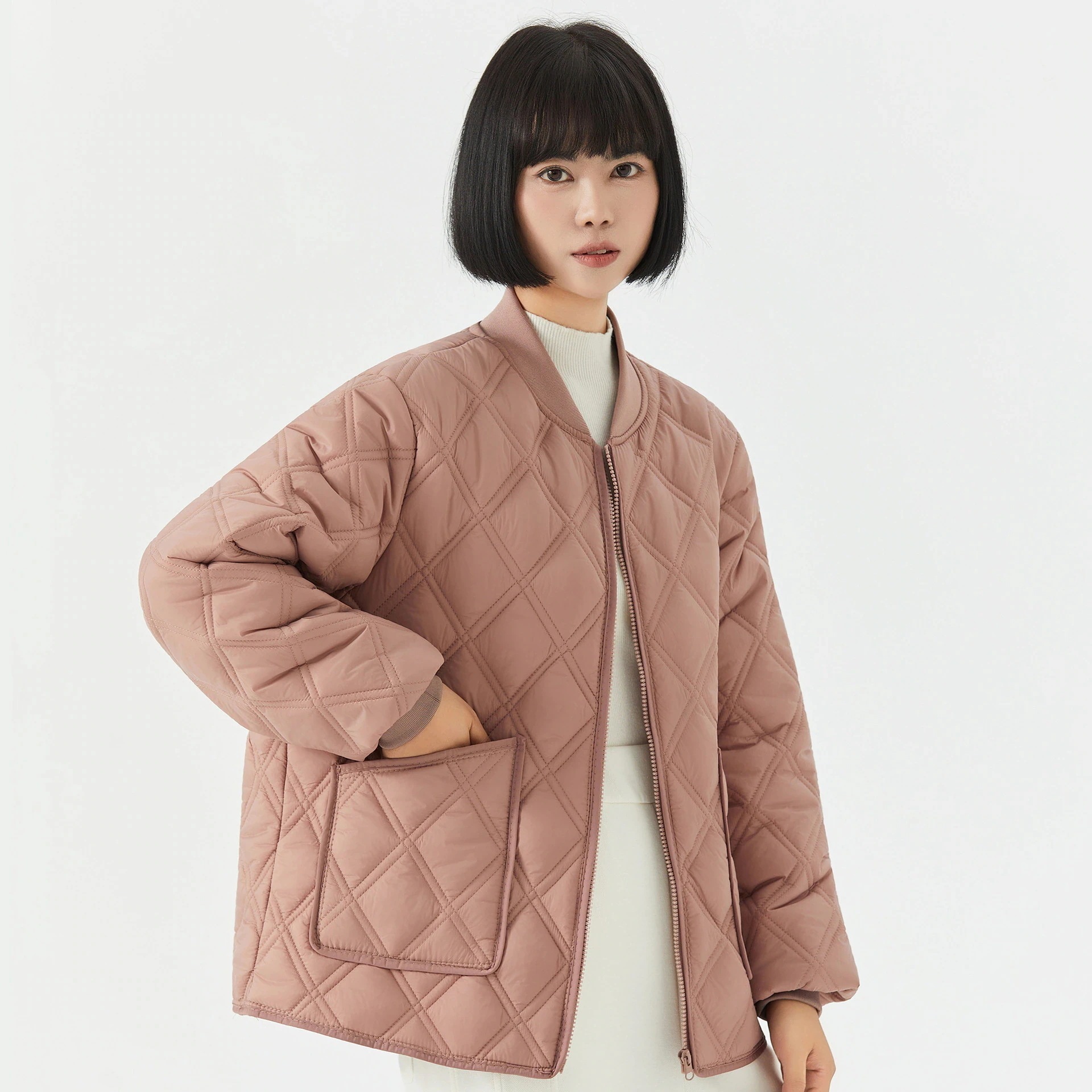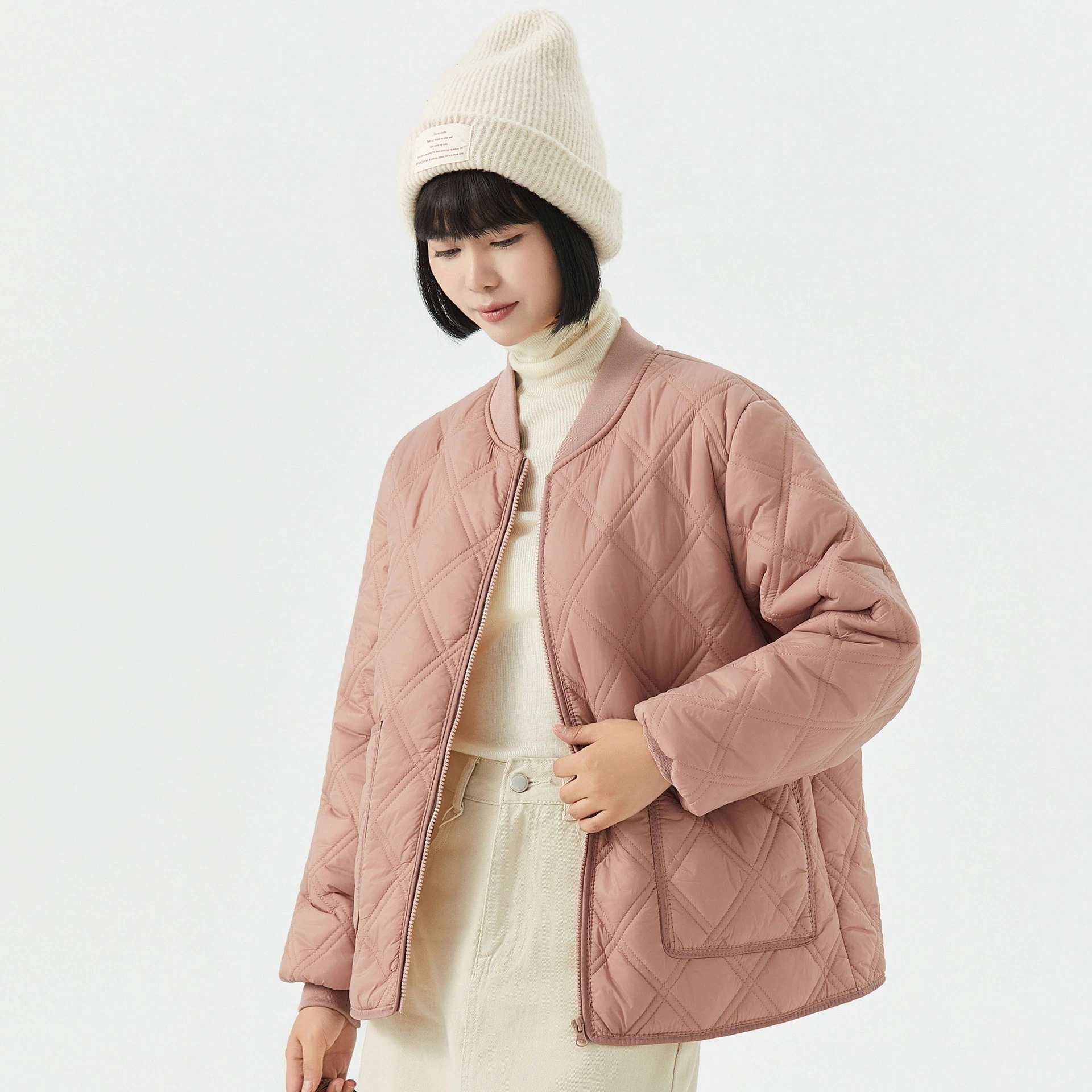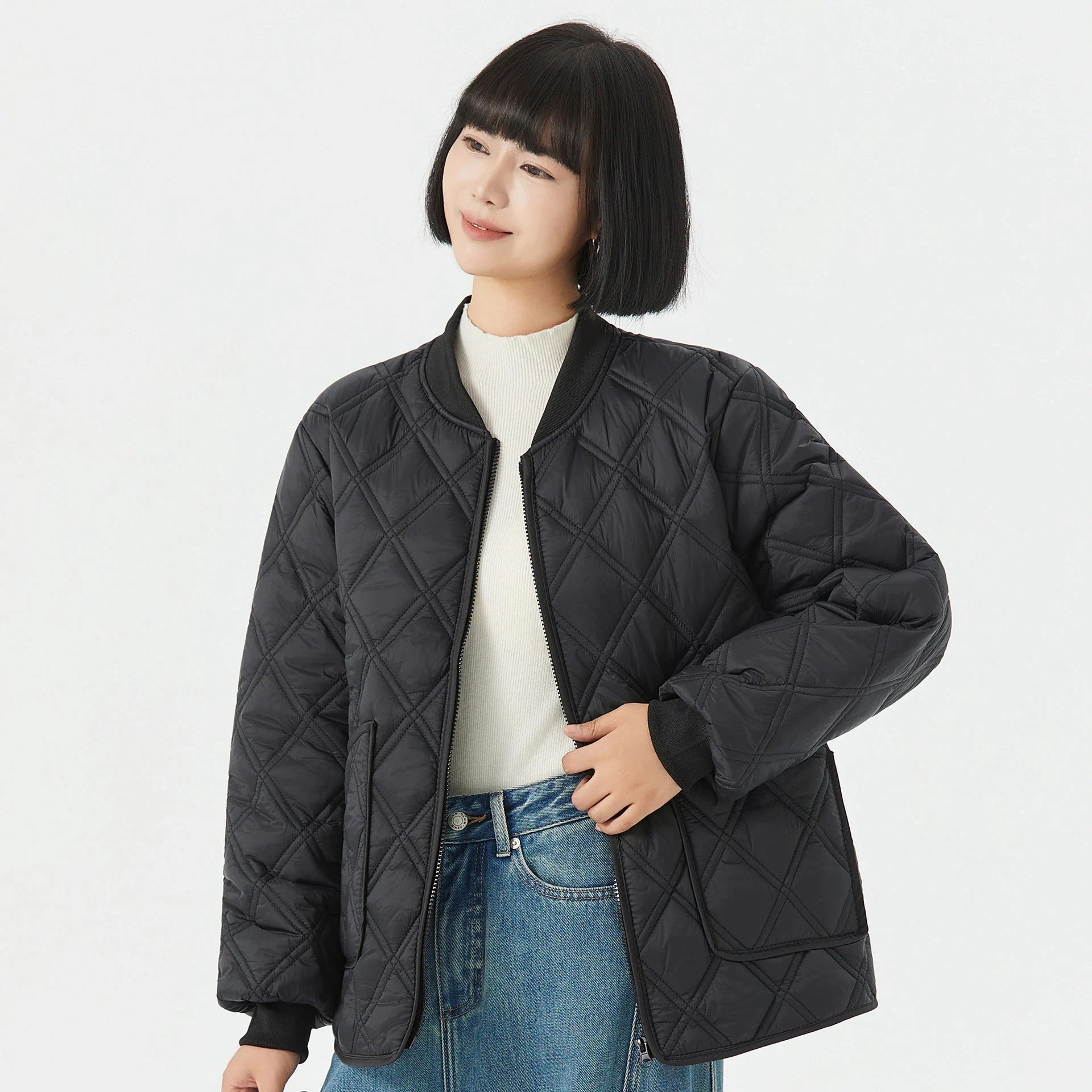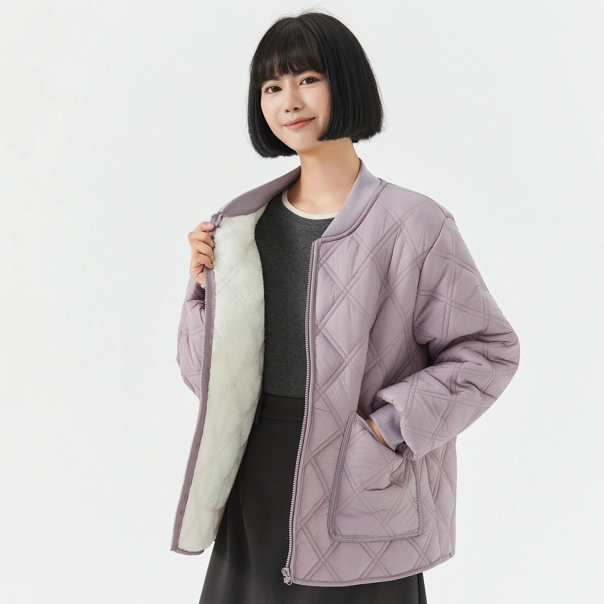 レディース用保温長袖コットンインナー ホームウェア カップル男女兼用 コットンコート フリース裏地付き リブネックダウンジャケット
