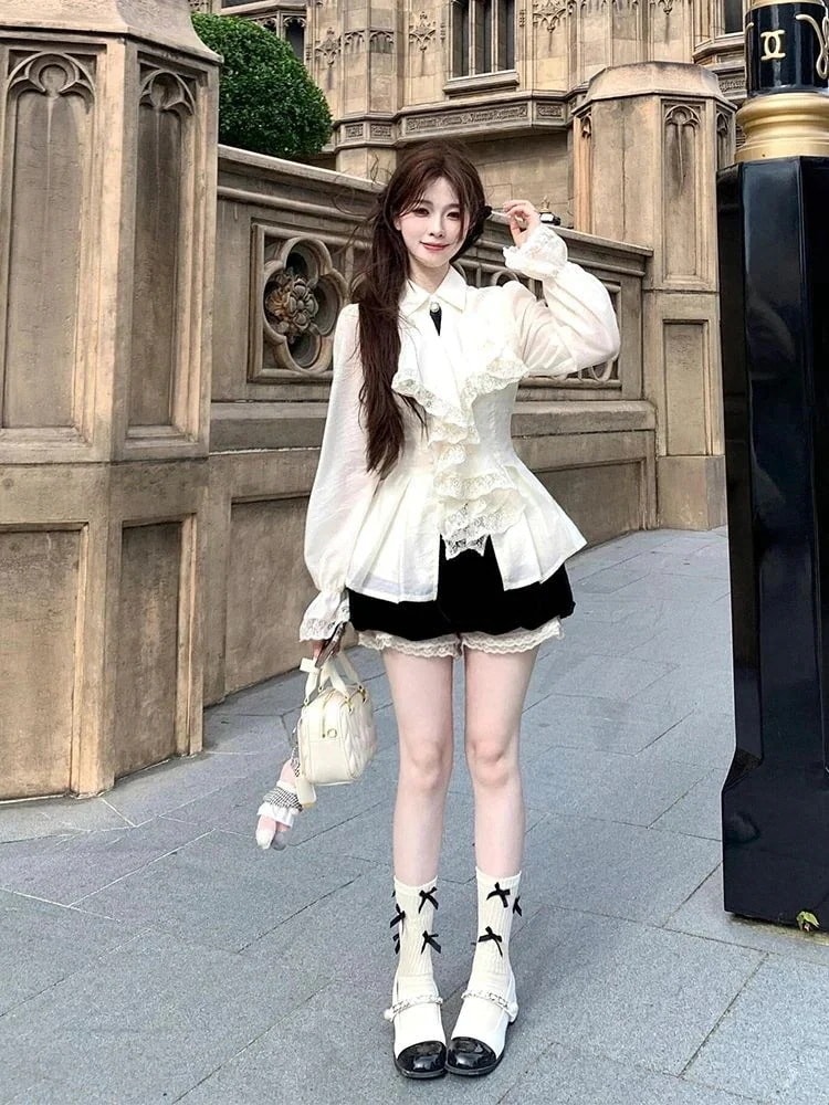 Qoo10涼しく楽ちんセットアップフレンチレースワンピース の新作ファッション レディース きれいめシャツ デザイントップス+パンツ セットアップ