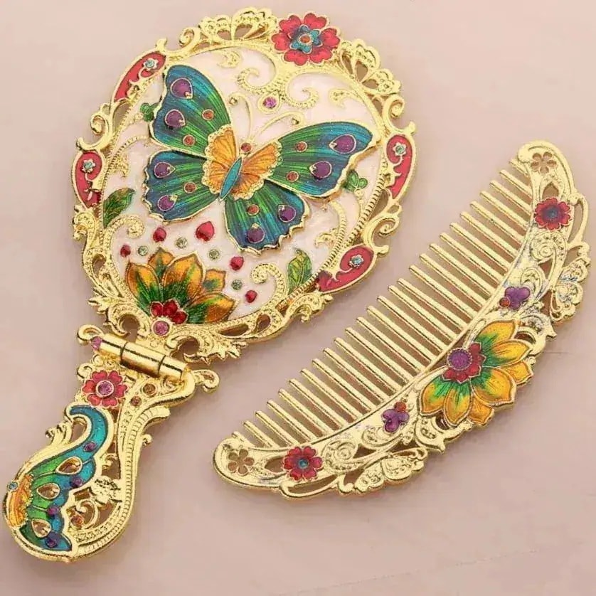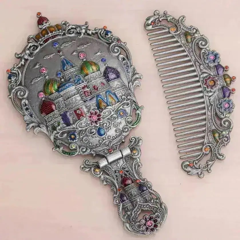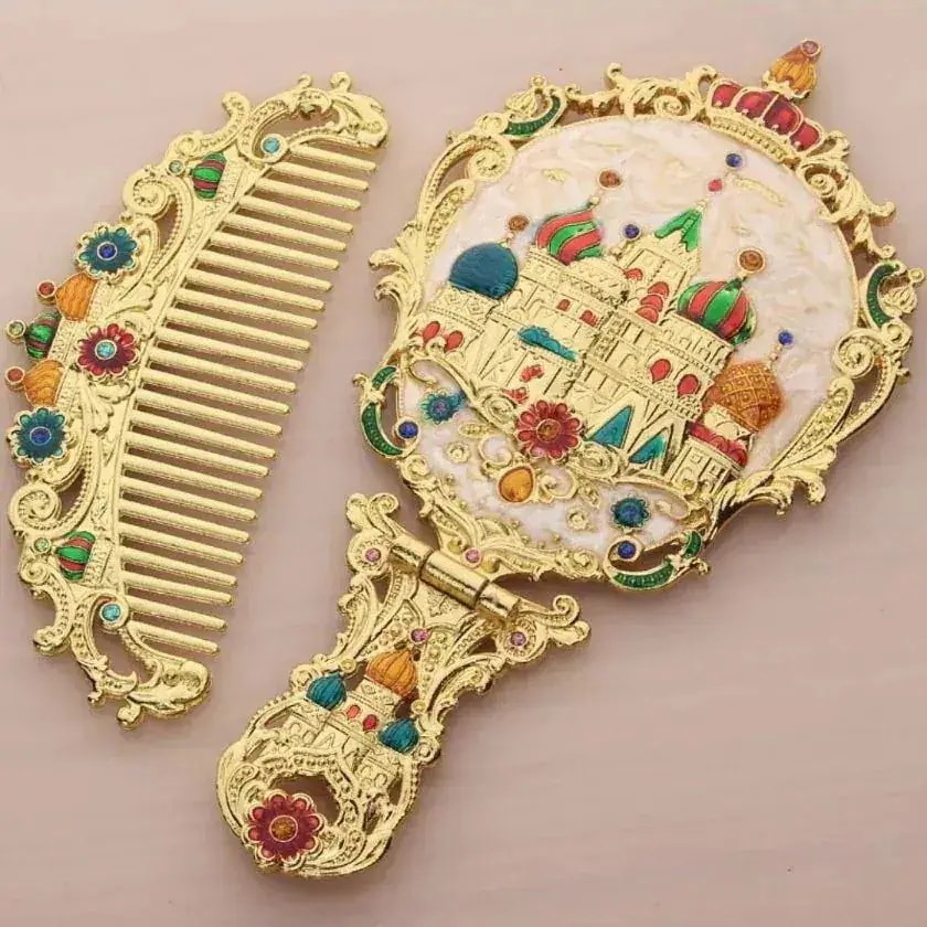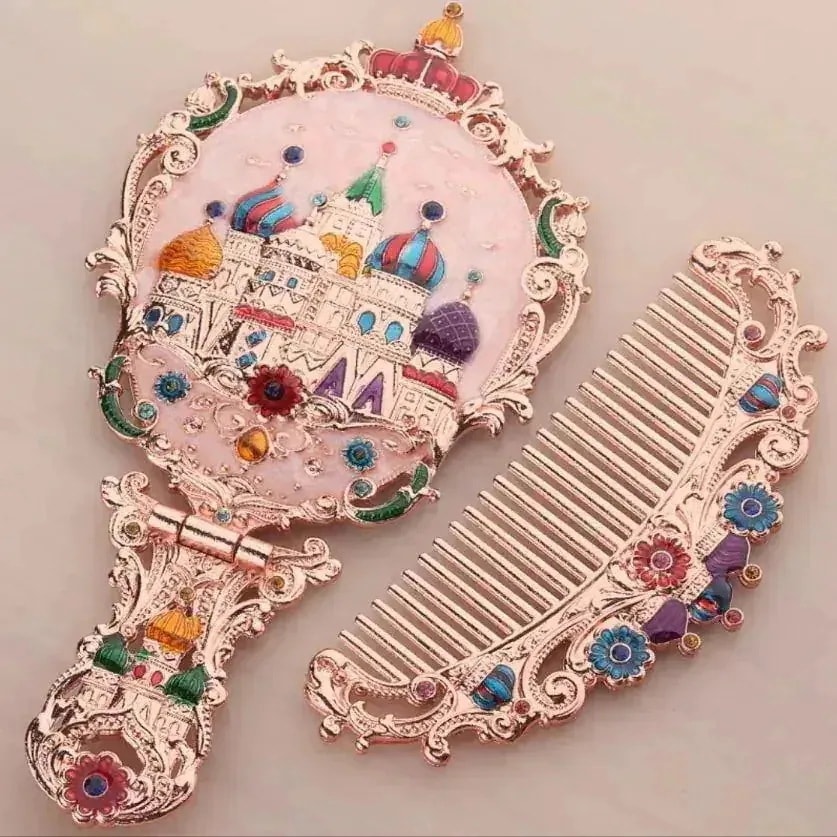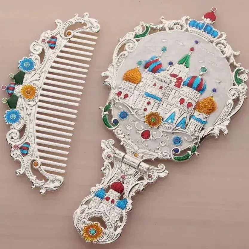 手鏡 ハンドル小型ミラー櫛セットレトロ携帯メイクアップミラー折りたたみデスクトップ王女ミラー