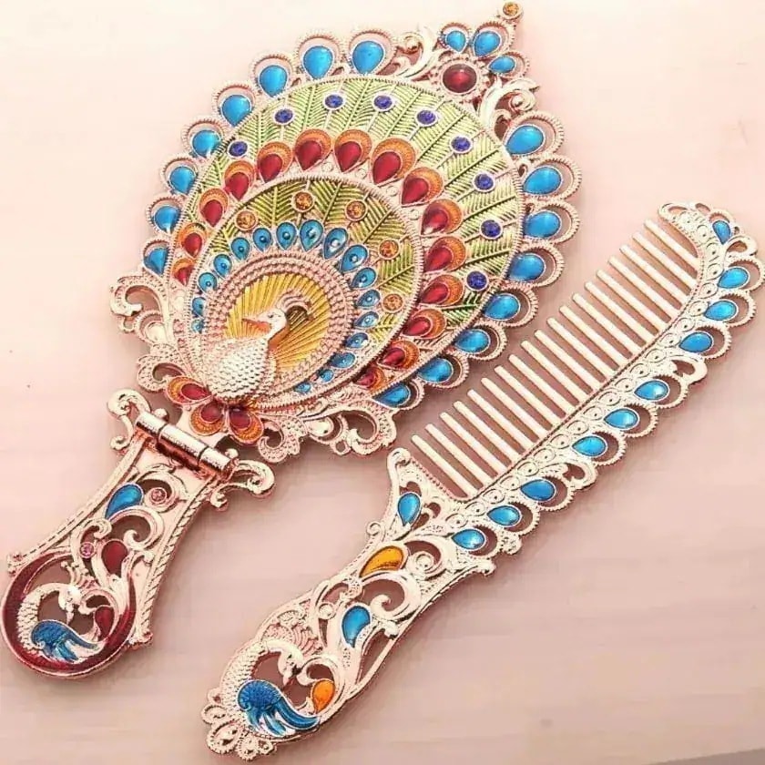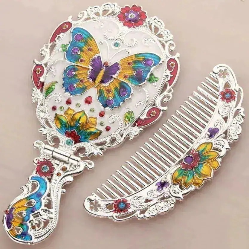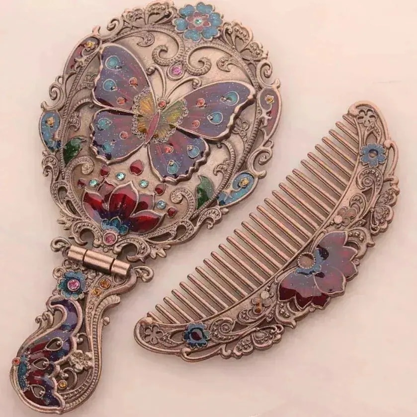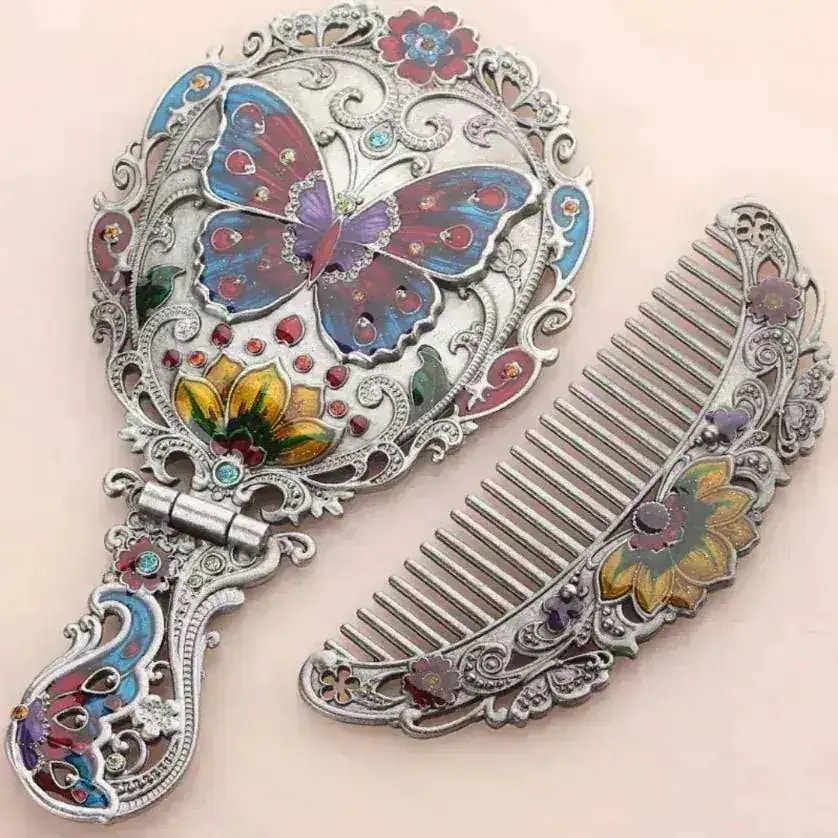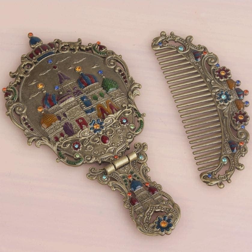 手鏡 ハンドル小型ミラー櫛セットレトロ携帯メイクアップミラー折りたたみデスクトップ王女ミラー