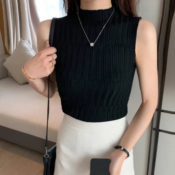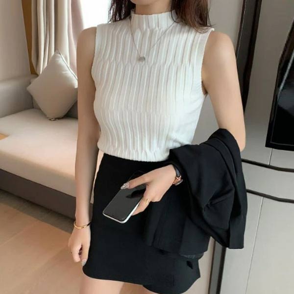 【限時割!引!】ハイネックニット ノースリーブ リブ タンクトップ スリーブレス ニット タイト