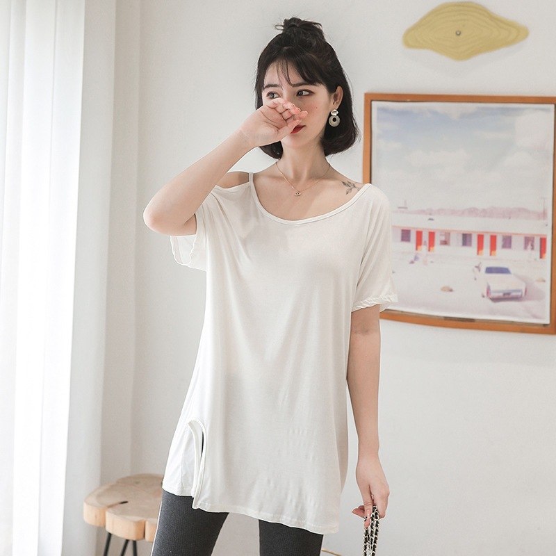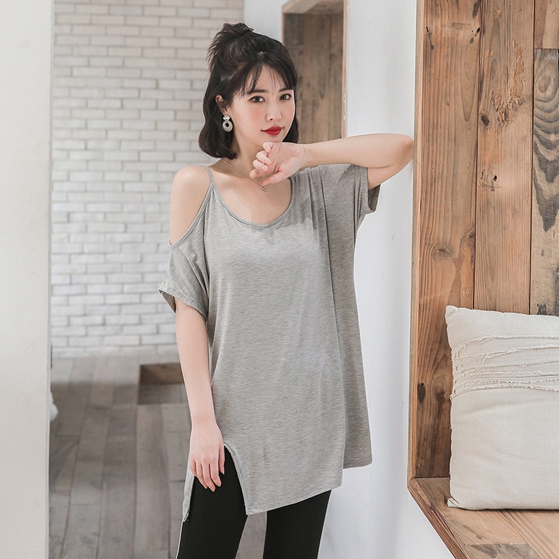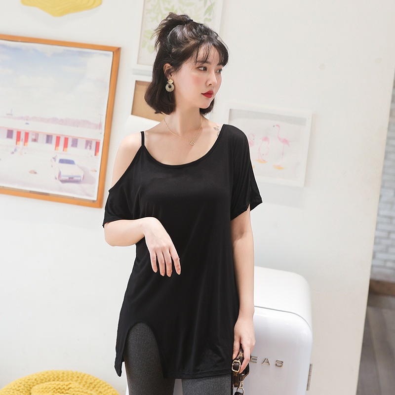 努力機肩tシャツ女性夏韓国版ゆったりしている中で長いタイプフォークストラップ半袖tシャツは肩上着を漏らします