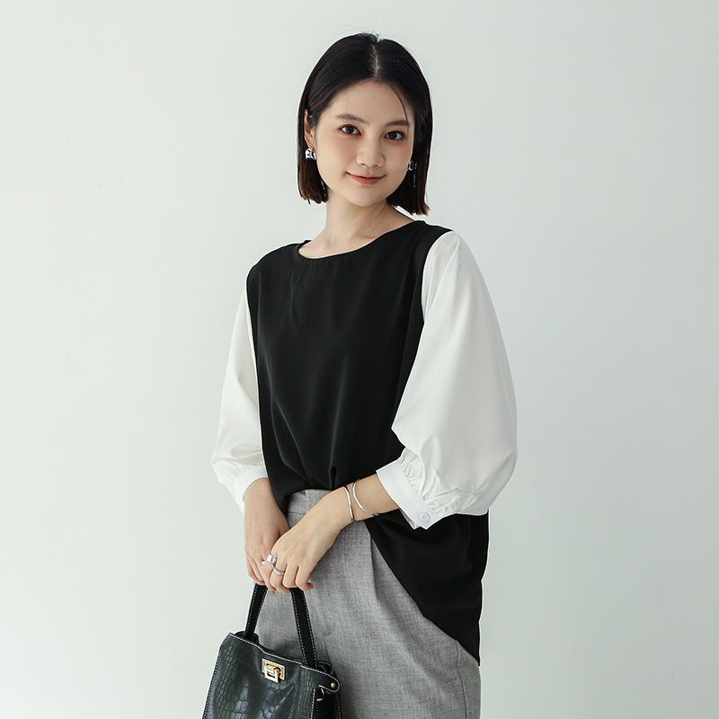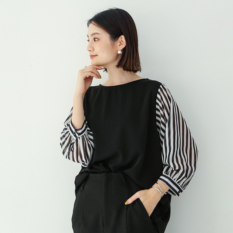 韓国婦人服夏ゆったりした上着五分袖シャツは偽2つストライプ丸首tコウモリ袖をつなぎ合わせます