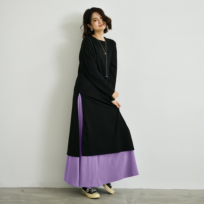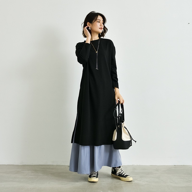 韓国新型春秋カジュアル二点セット長開フォーク丸首上着ゆったりロングスカート