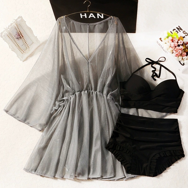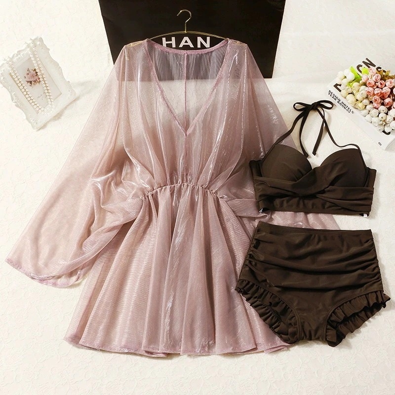 水着 レディース ビキニ 3点セット セパレートスイムウェア 長袖 シースルー シアーワンピース パット付き カバー 紫外線対策 無地 可愛い おしゃれ ビーチウエア セクシー 温泉水着 海水浴 旅