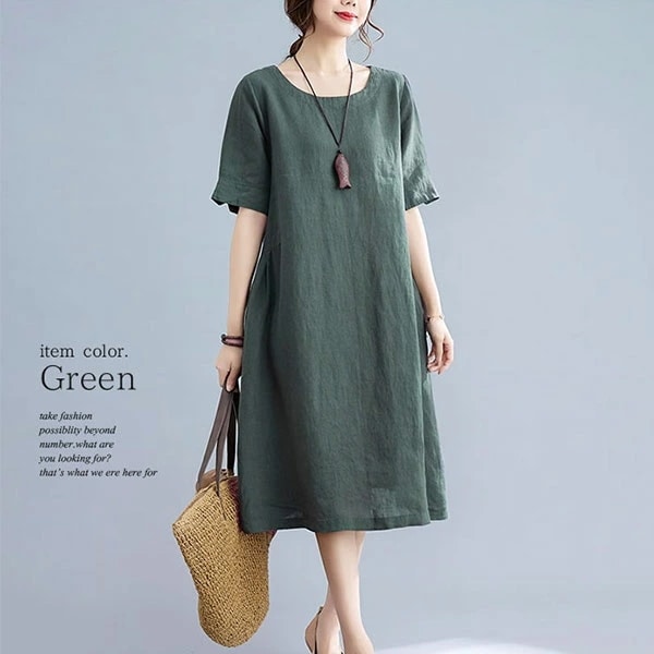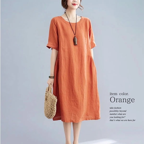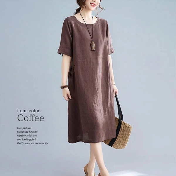 ロング ワンピース 綿麻 レディース リネンワンピース 五分袖 マキシワンピース Uネック フレアワンピース 半袖 ロングワンピ ポケット付き オールインワン 敏感肌 体型カバー 服 ゆったり 大人