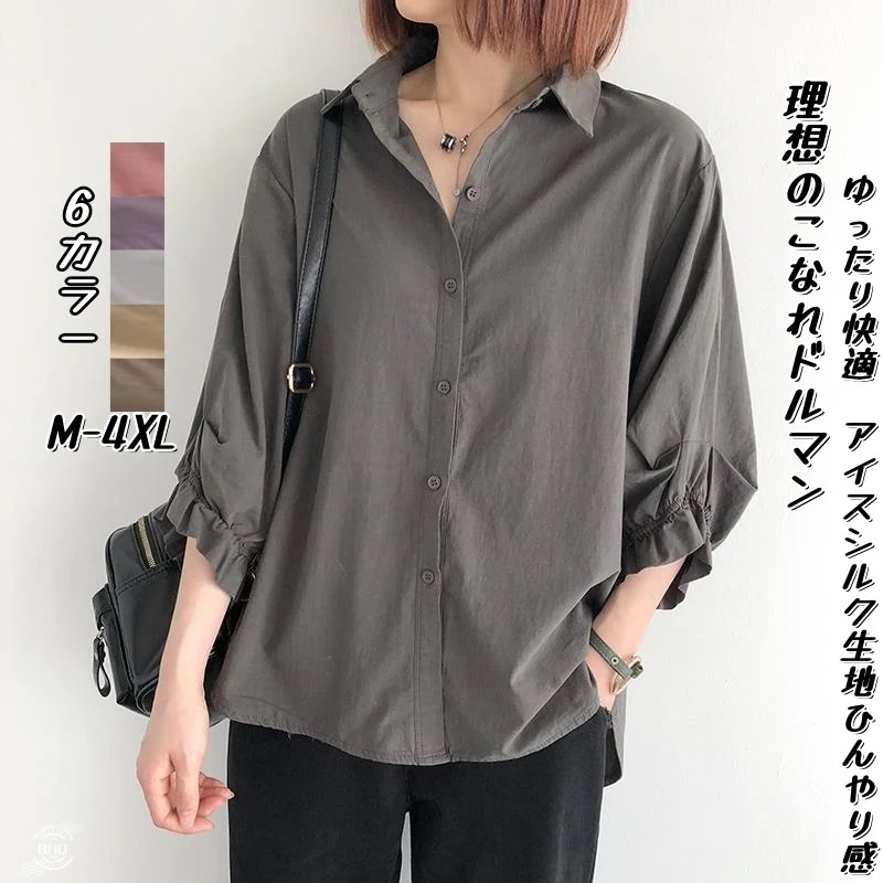韓国風 ドルマンスリーブ シャツ レディース ゆったり 大きいサイズ 薄手 七分袖 着痩せ 通勤 紫外線対策 カジュアル