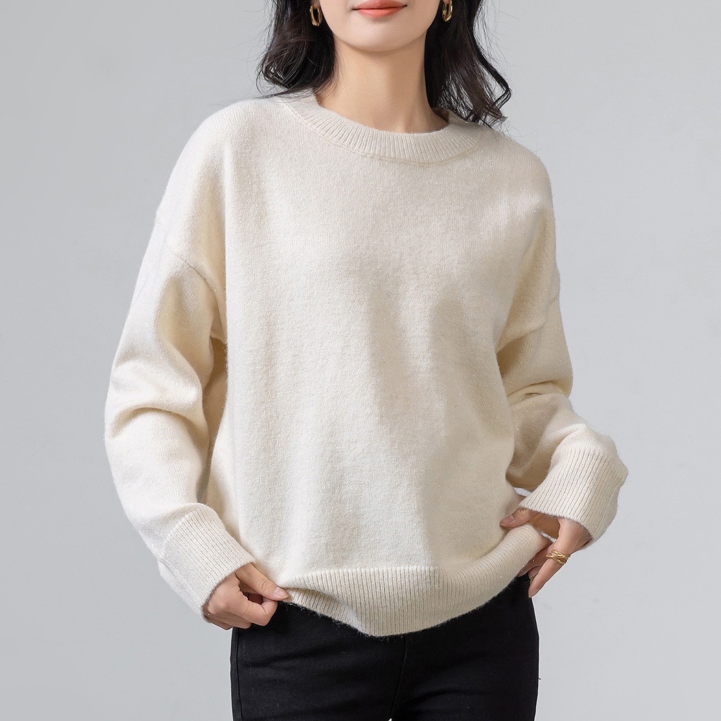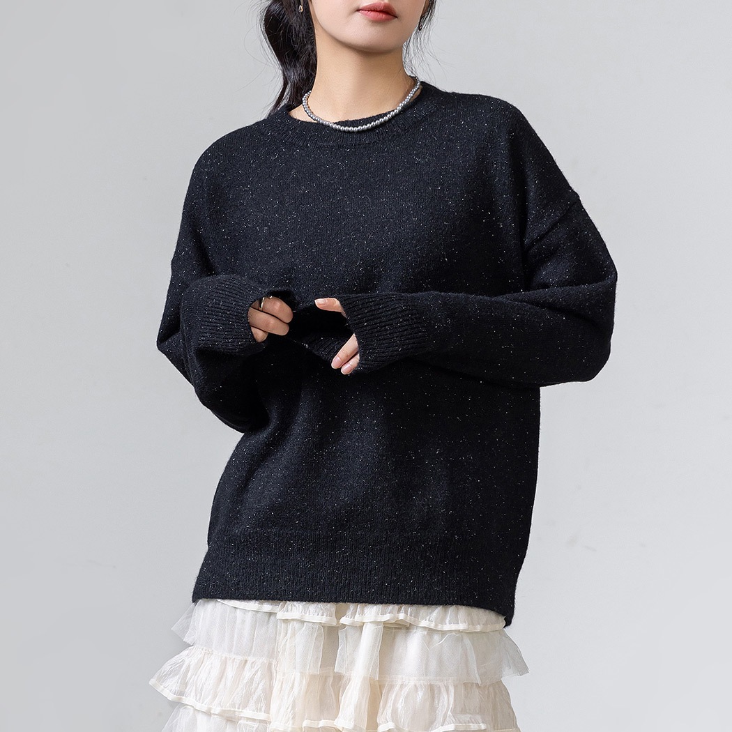 『最安値販売』ニット ラメ 糸 セーター トップス 長袖 レディース 防寒 プルオーバー ハイゲージ クルーネック 首周り 袖口 裾 リブ 秋冬 黒