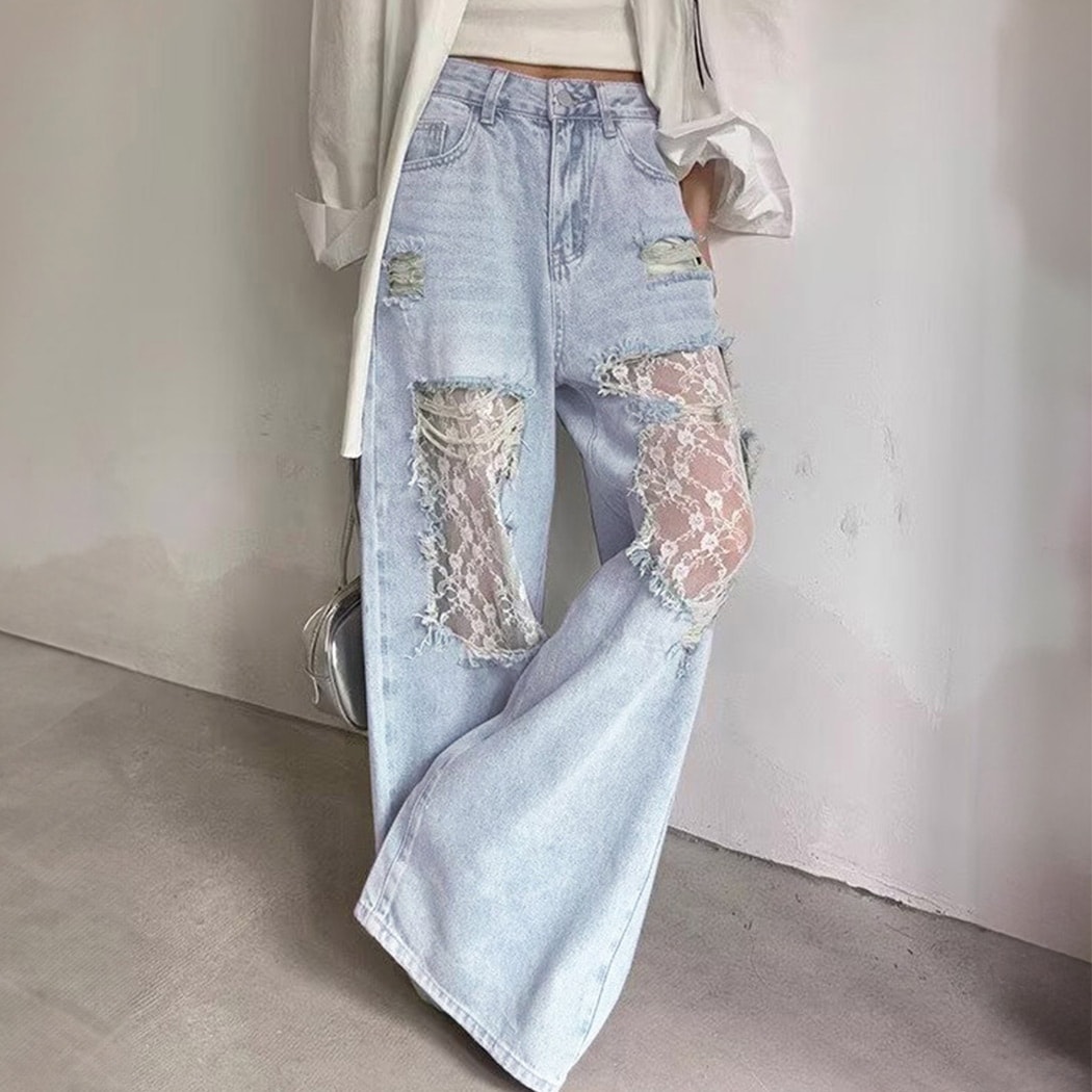『最安値販売』ダメージデニム レース ワイド ストレート ワイドパンツ レディース パンツ ジーンズ ハイウエスト ベルトループ ポケット ボタン ファスナー 中厚手 春 夏 秋