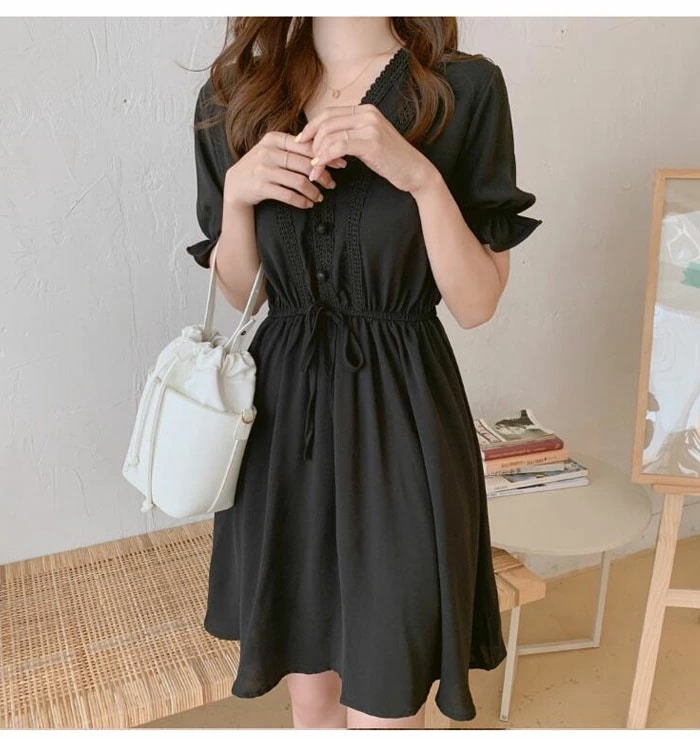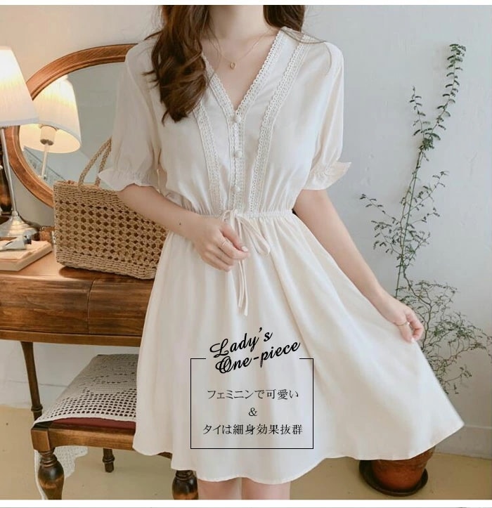 レディースワンピース Vネック 半袖 ワンピース エレガント 女性ワンピ 春 夏 秋 ウエストゴム 膝丈 パーティー ワンピース 白 黒 フリル 上品 レース襟ワンピース キレイめ 可愛い Aライン