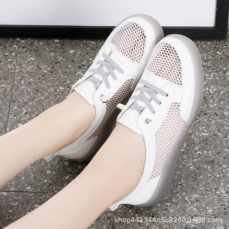 夏の女子学生の靴の本革の底の柔らかい底の学生のサンダルのネットの通気性の透かし彫りの足のカジュアルな白い靴