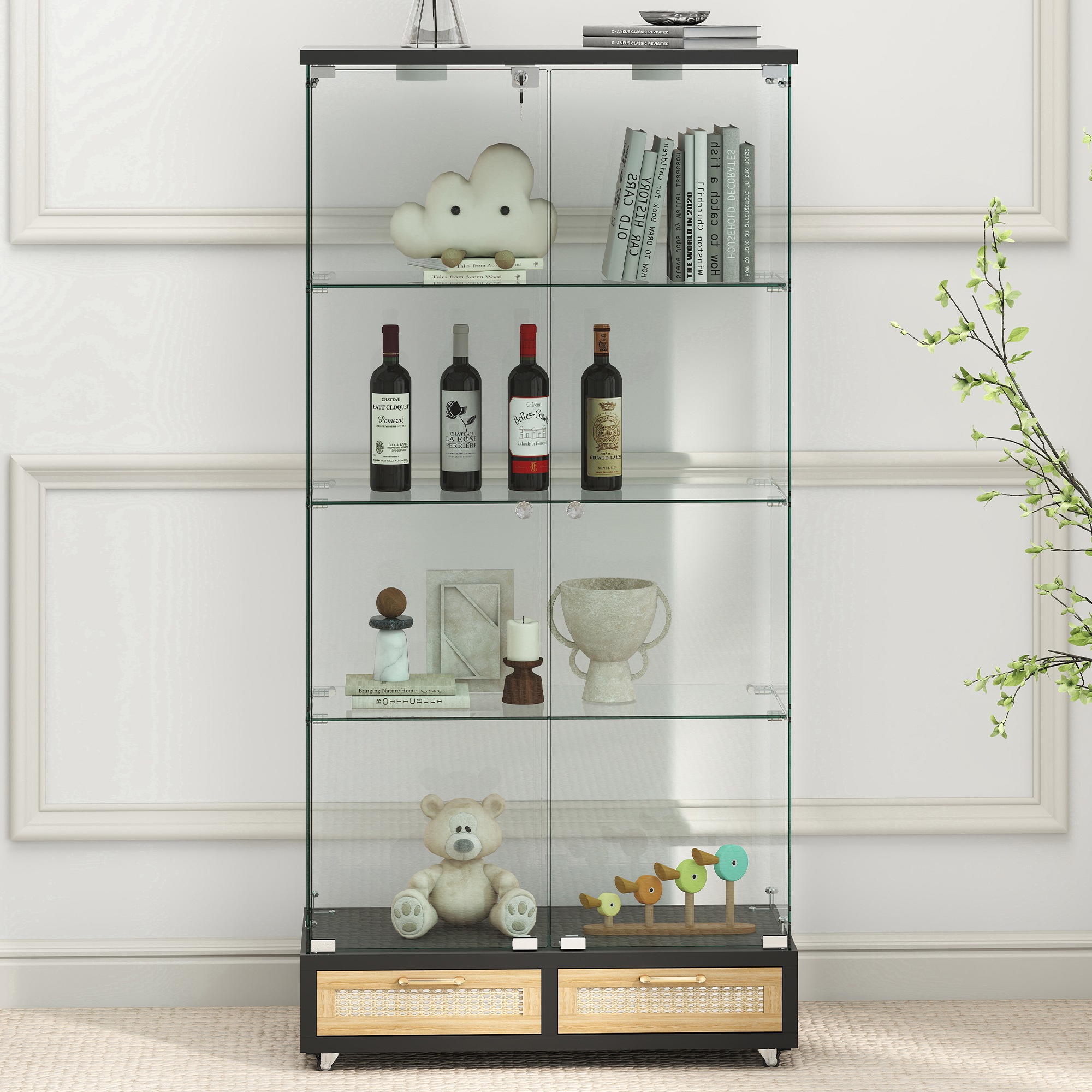 [国内発送!]LED照明・藤編み引き出し付き ガラス収納キャビネットロック付き強化ガラス 4段 展示ケースリビング・寝室用 両開きドア ブラック