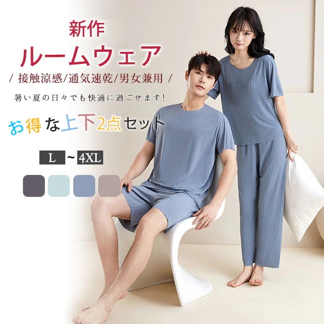オススメ新品 上下2点セット ルームウェア メンズ パジャマ 夏用 パジャマ メンズ レディース 冷感パジャマ カップル 男女兼用 半袖 パジャマ ゆったり 部屋着 寝巻き ナイトウェア トップス