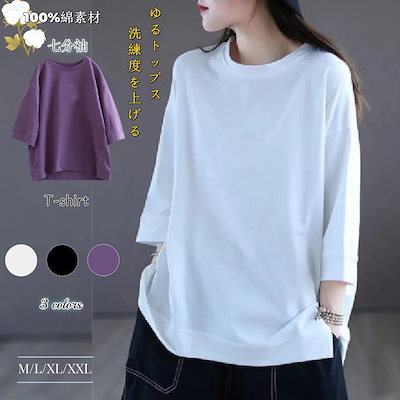 100%綿素材 Tシャツ 7分袖 レディース ゆったり 着痩せ 韓国 無地 夏服Tシャツ 半袖 レディースゆるトップス[3カラー]