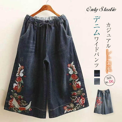 【迅速な出荷】デニム パンツ ワイドパンツ デニムパンツ 刺繍 花柄 綿 コットン ワイド ゆったり ハイウエスト 紐 7分丈 春 夏 ポケット 着瘦せ カジュアル 体型カバー 通勤 OL オフィス