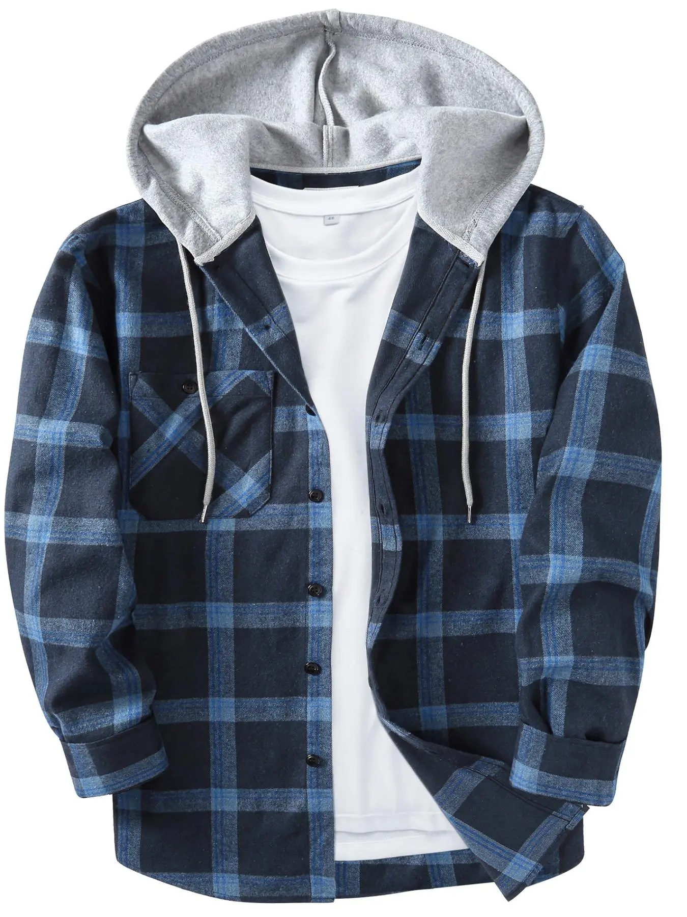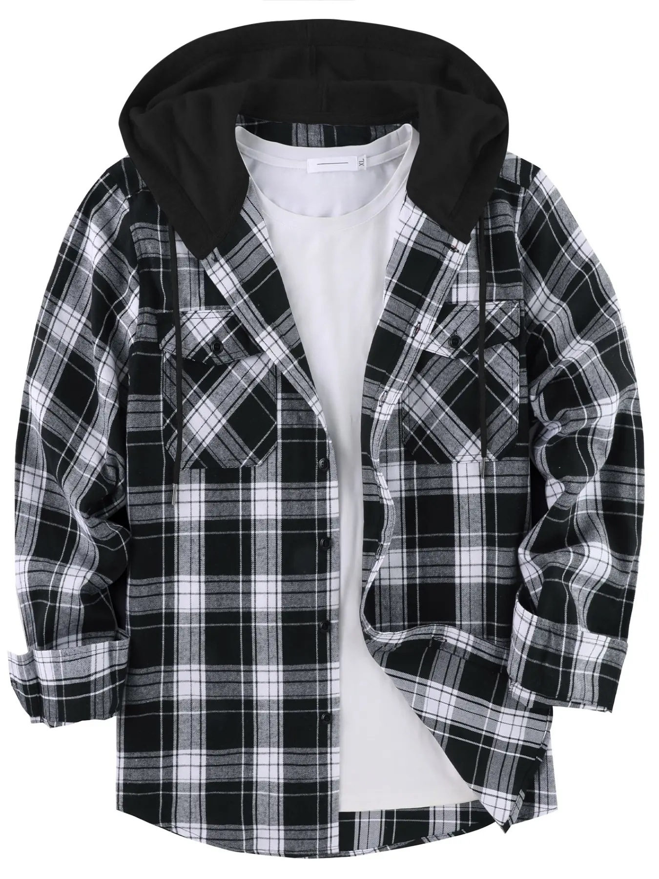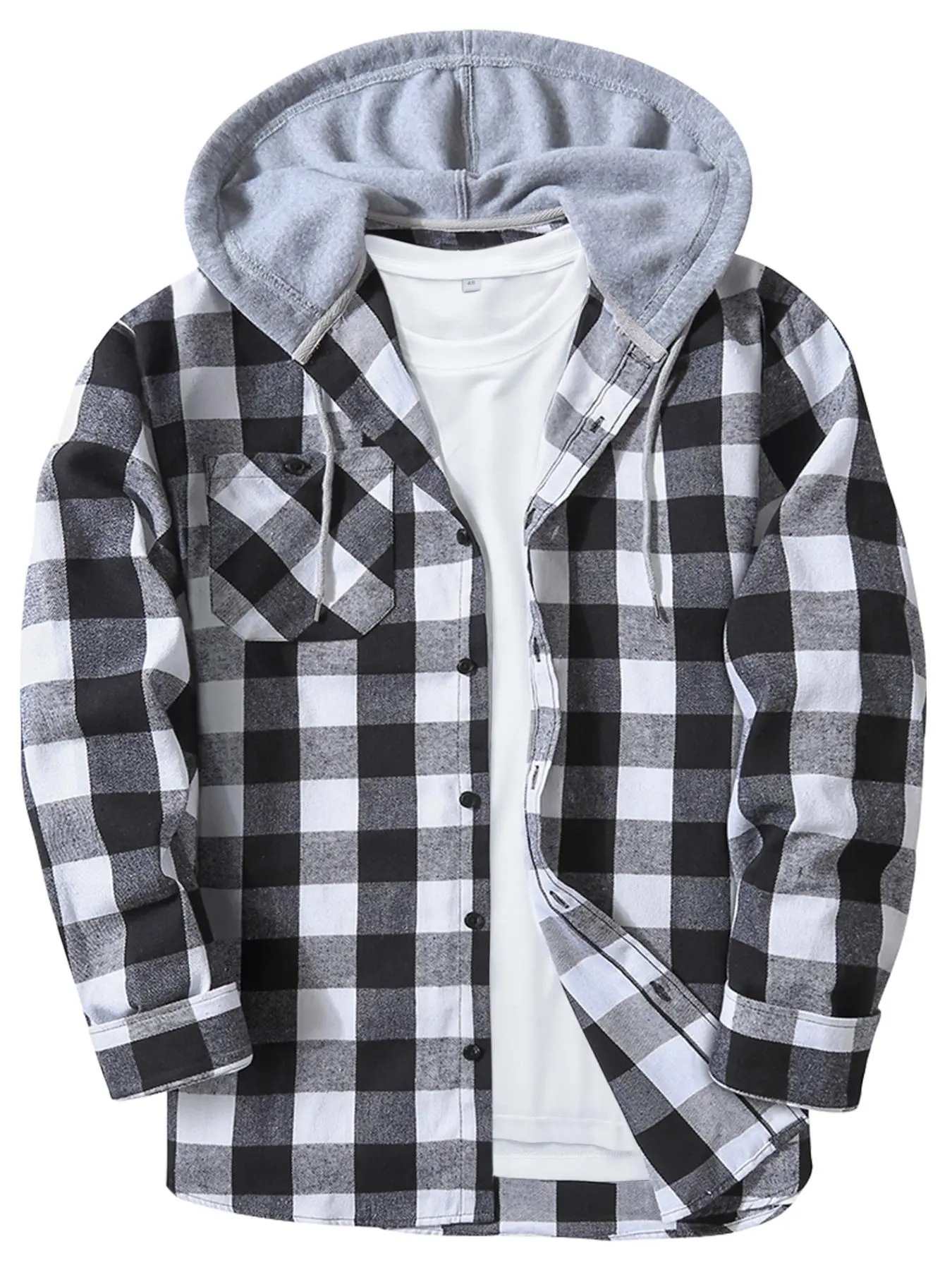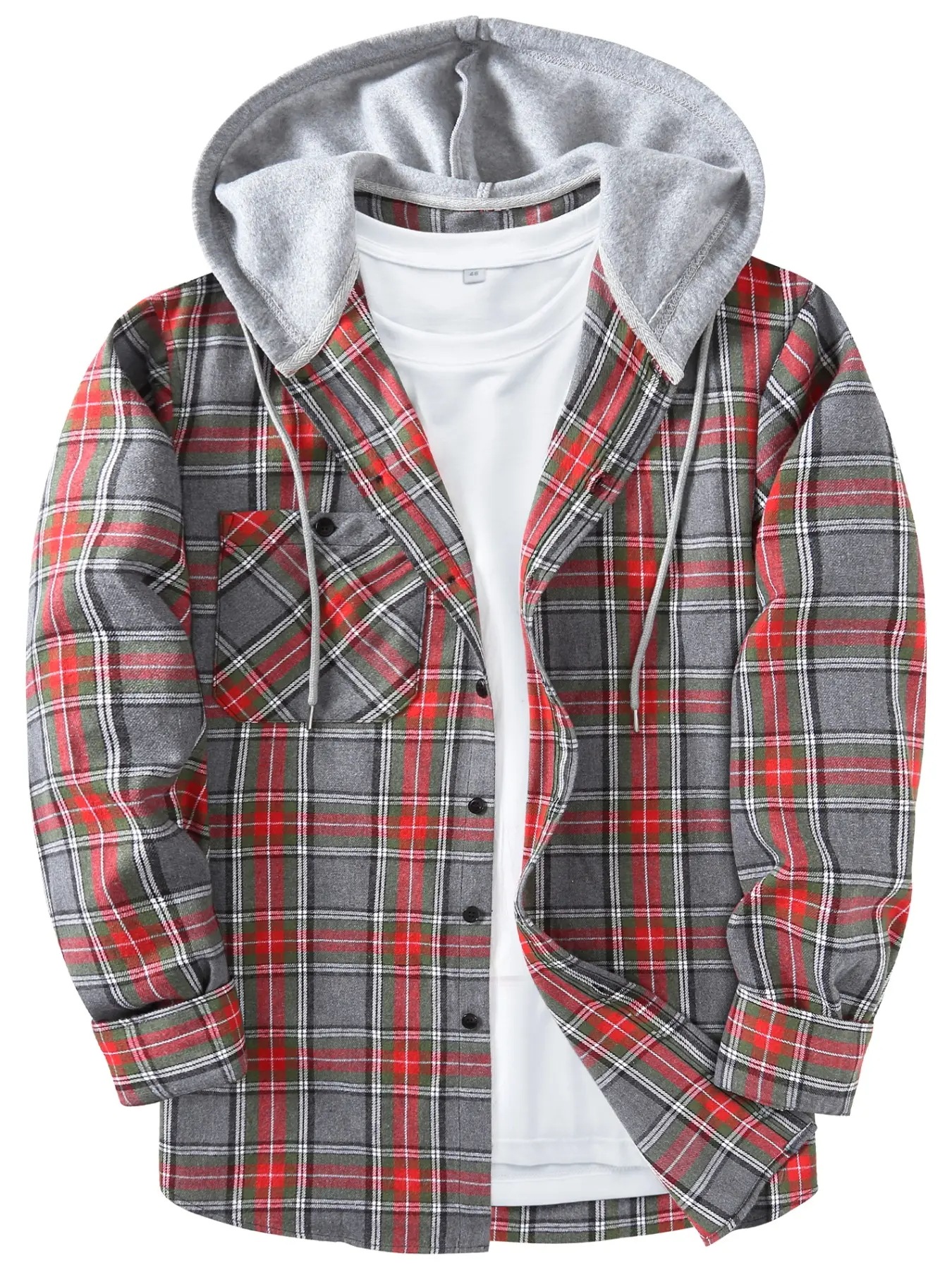 | 材料/素材 | メンズチェック柄ボタンフロントドローストリングフード付きシャツ、レギュラーフィットカジュアル長袖ポケットトップ、日常着に最適なメンズウェア | ||