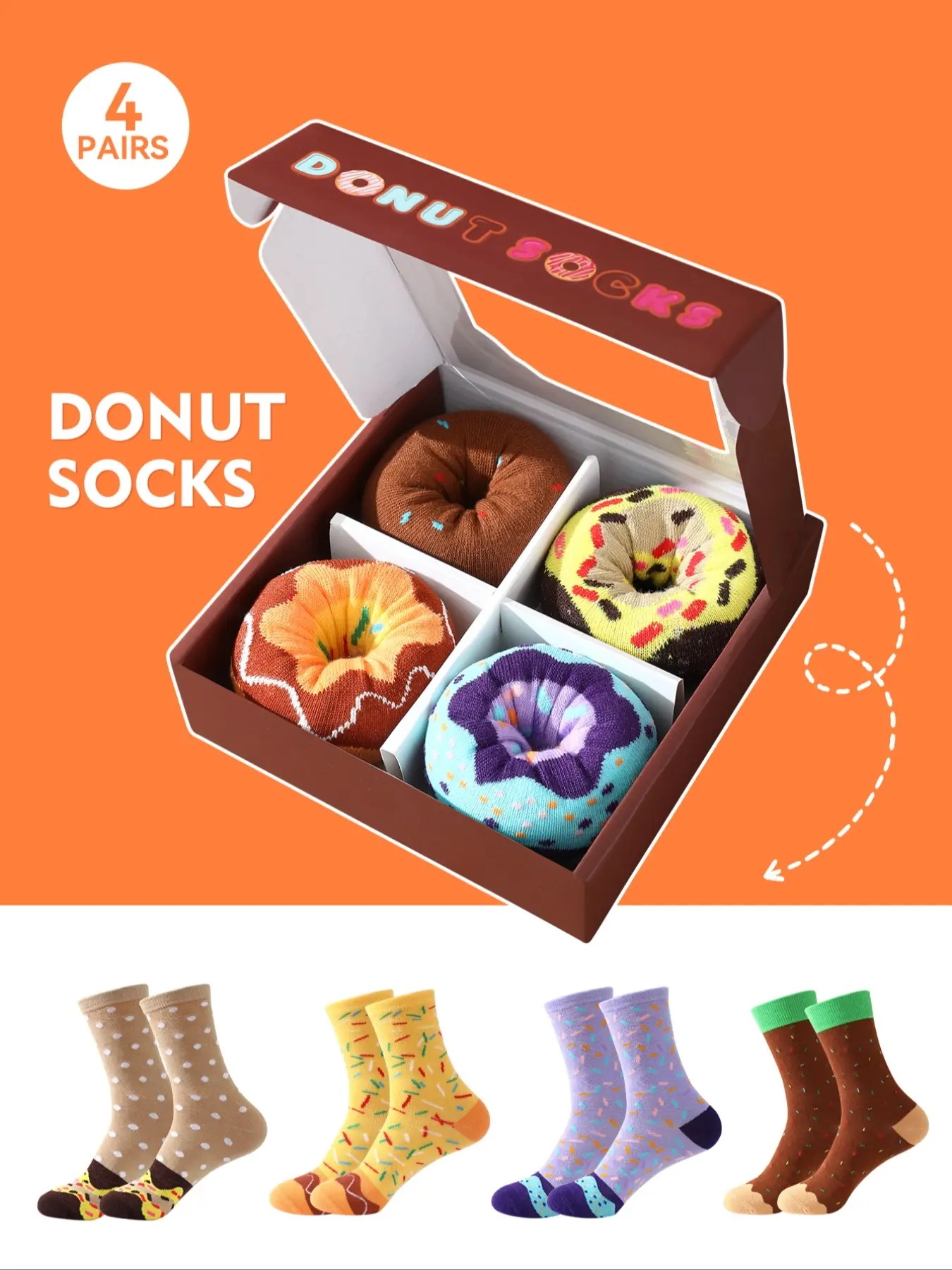 | 材料/素材 | ドーナツ柄のユニセックスソックス4足セット(ギフトボックス入り)。柔らかく快適で、カラフルなカジュアルソックス。バレンタインデー/イースター/ラマダン/スーパーボウルの記念に最適。パーティーや普段使いにぴったり。パートナーやご家族へのサプライズギフトに。人気商品。 | ||