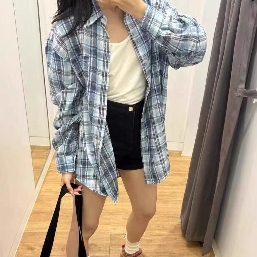 アメリカン リラックス ポロ 襟 チェック シャツ レディース インナー 重ね着 ゆったり カジュアル カバー 長袖 シャツ アウター カーディガン921399