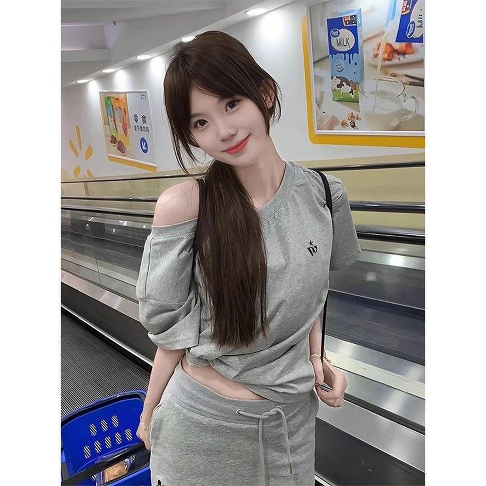 コットン半袖Tシャツ レディース ドロップショルダー オフショルダー プリント 斜め肩 中長 ミステリアス 体型カバー 綿100% 白黒 グレー 夏 春 露出