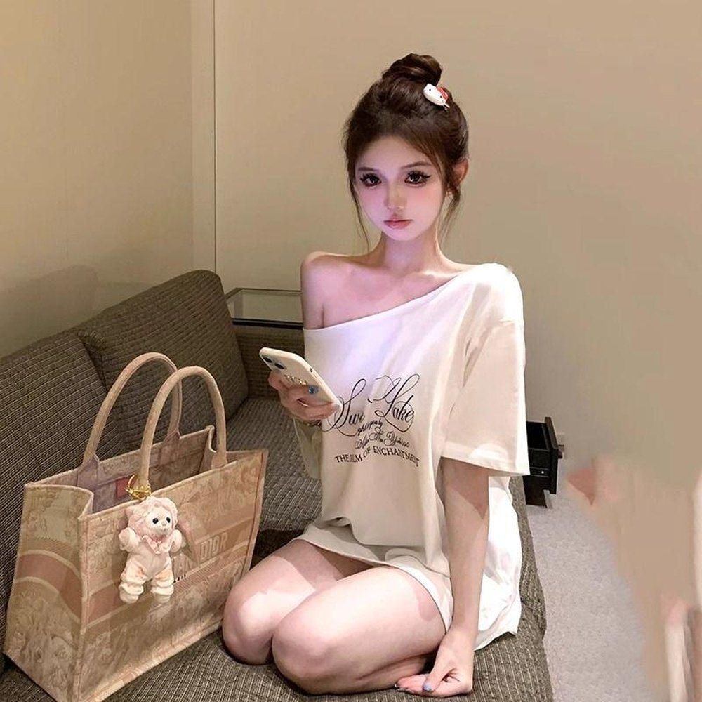 大きいサイズ コットン半袖Tシャツ レディース ドロップショルダー 絶美 オフショルダー プリント 斜め肩 トレンド 綿100% 白黒 グレー 夏 春 露出 体型カバー