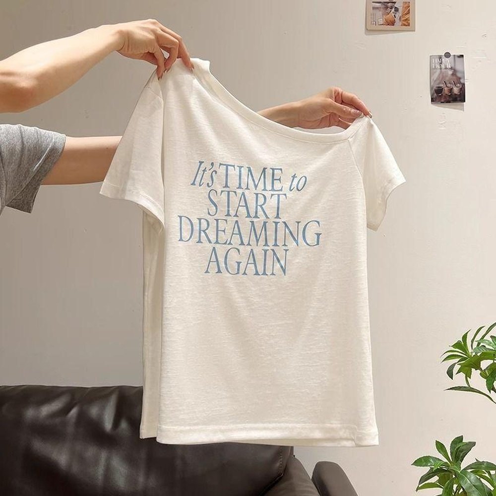 BF風 オフショルダー プリント 半袖Tシャツ 斜め肩 学生 コットン レディース ドロップショルダー ゆったり 綿100% 白黒 夏 春 露出 デイリー