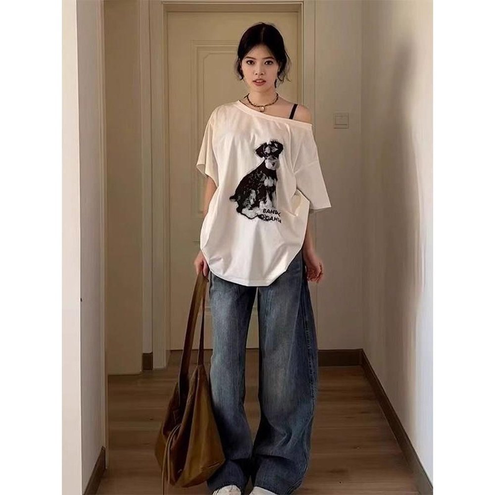 男女兼用 少女 コットン半袖Tシャツ レディース ドロップショルダー オフショルダー プリント 斜め肩 海外 綿100% 白黒 グレー 夏 春 露出 デイリー