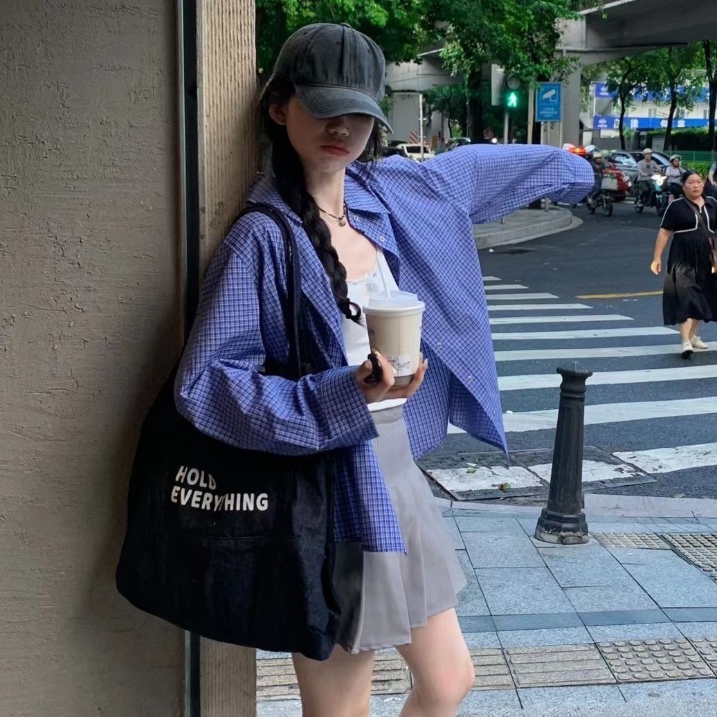 青 チェック シャツ レディース 長袖 アウター カジュアル ファッション ゆったり 重ね着 トップス シャツ アウター631325
