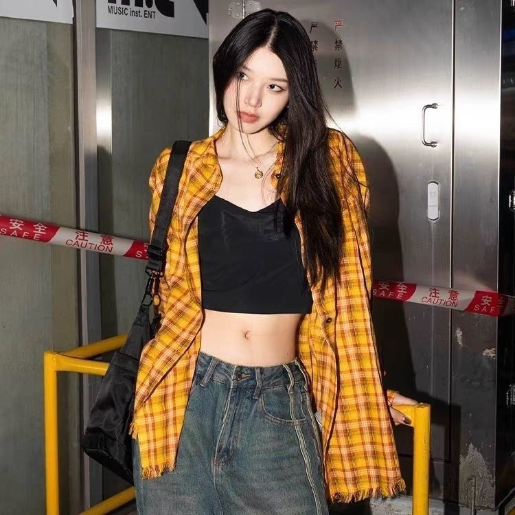 アメリカン レトロ 黄 チェック シャツ ゆったり アウター 裾 フリンジ デザイン性 トップス1335