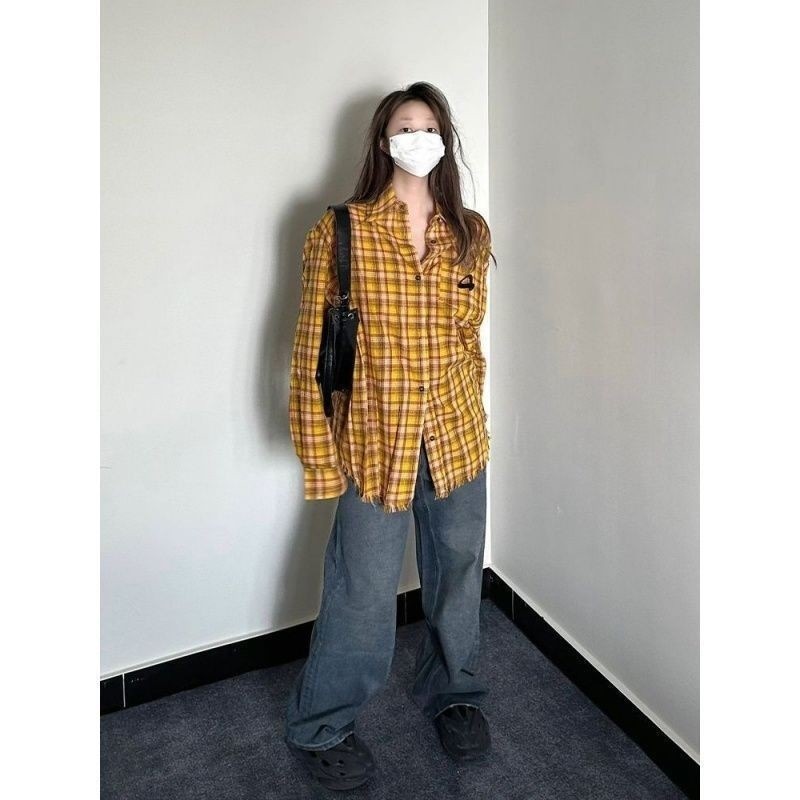 レトロ ミント マンボウ 黄 チェック 長袖 シャツ ゆったり シャツ ファッション アウター 重ね着 トップス1336