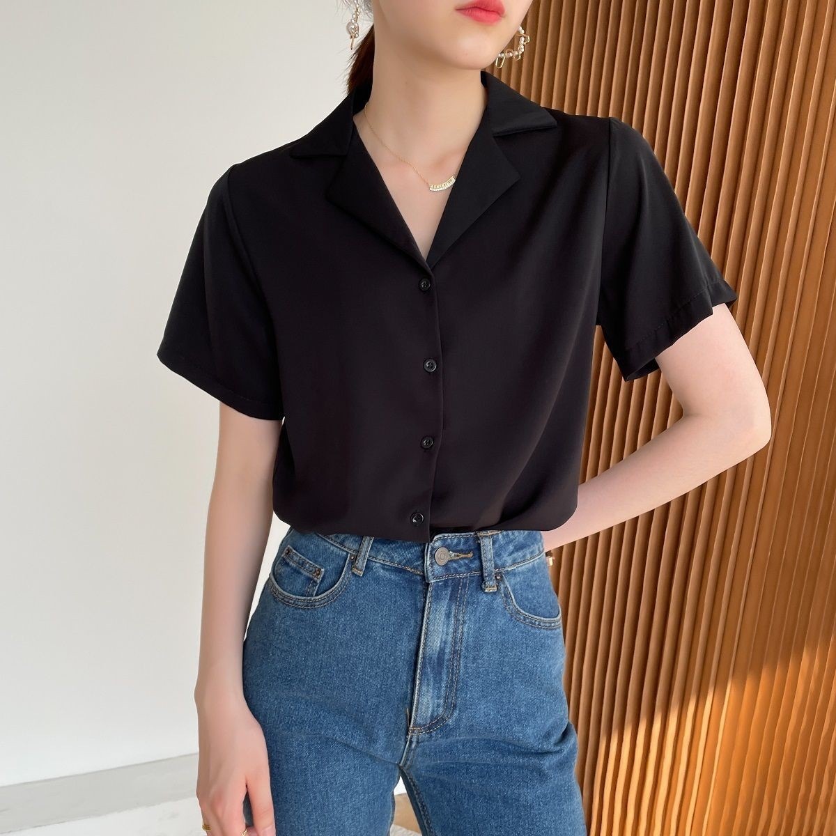 スーツ 襟 黒 シャツ レディース 半袖 シフォン トップス レディース おしゃれ ゆったり ドレープ シャツ741359
