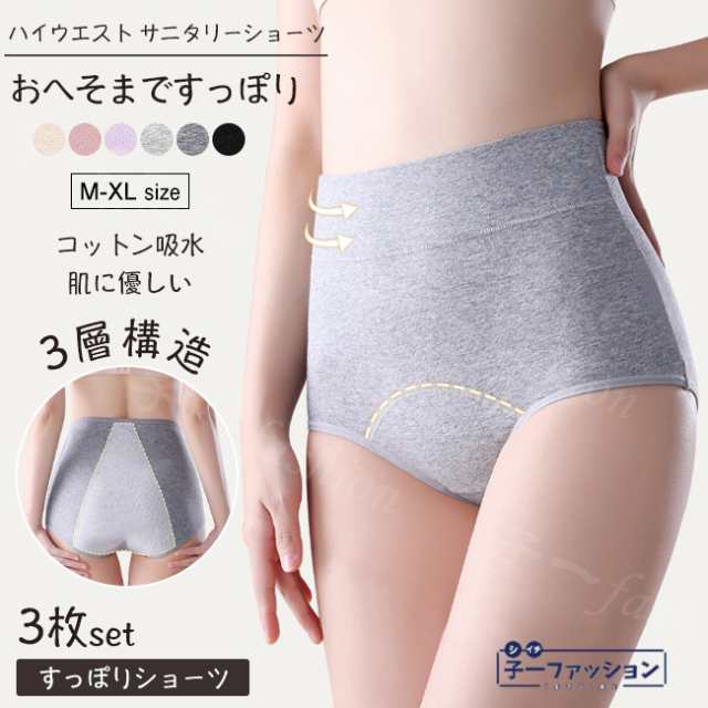 [3枚セット] ハイウエスト サニタリーショーツ レディース 下着 サニタリー パンツ 大きいサイズ 生理用 前漏れ防止 後ろ漏れ防止 速乾 通気性 無地 深め 深履き 綿 女性 フィット 保温 冷え