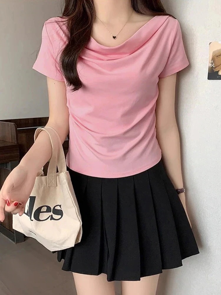 フレンチ デザイン性 ボートネック オフショルダー 半袖Tシャツ レディース 夏 ボディコン クロップトップ セクシー トップス Tシャツ カットソー