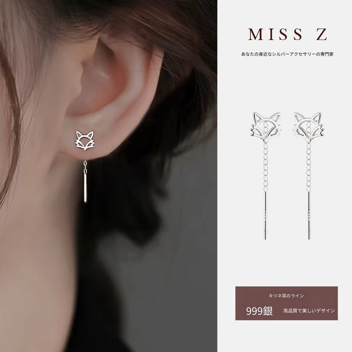 【Z小姐】キツネ ピアス イヤーカフ ロングチェーン 純銀 アレルギー対応 レディース エレガント 顔小効果 日常使い
