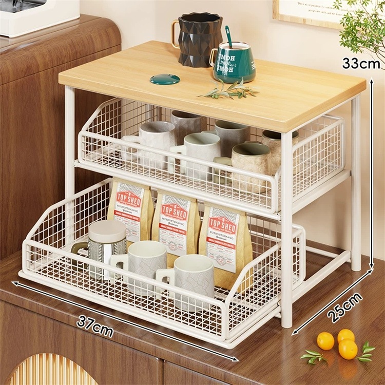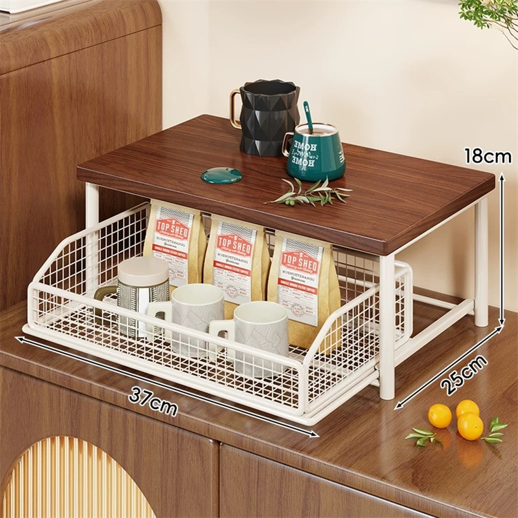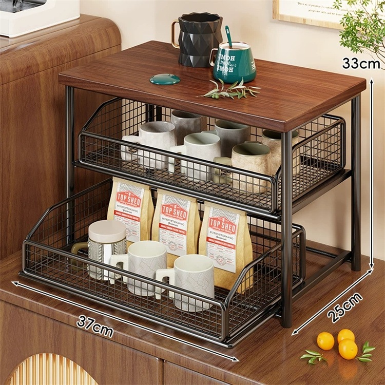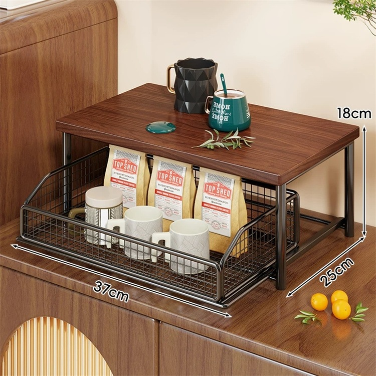 木目調天板 × ブラックメッシュ 2段ラック カップ・コーヒーグッズ収納に