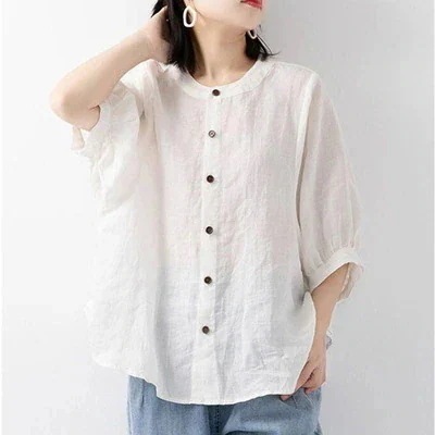 理想のこなれ ドルマン 綿麻 ブラウス 体型カバー 夏にも快適 シャツ Tシャツ 通勤 百掛け トップス レディース 着痩せ チュニック クルーネック半袖 無地 薄手 大きいサイズ