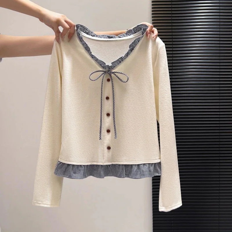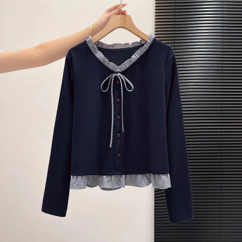 長袖 tシャツ レース裾 春 コーデ 無地 レディース ブラウス 秋 冬 アンダー 大サイズ パーカー 韓国 ファッション カットソー ニット なちょう結び