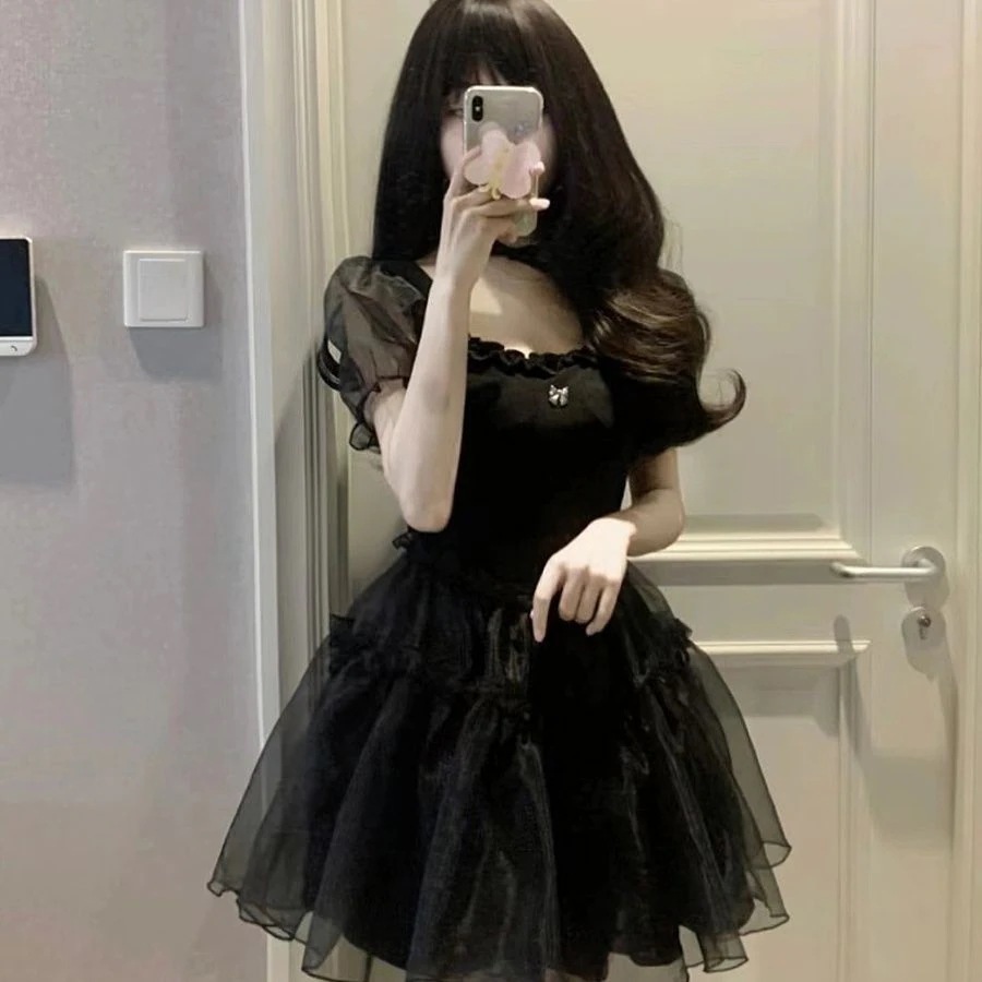 フランス式人気新作半袖ブラックワンピース 百掛け韓国ファッションポンポンスカート