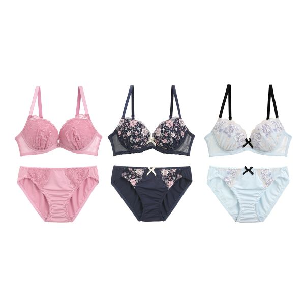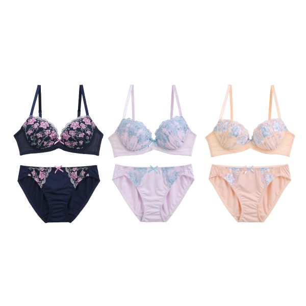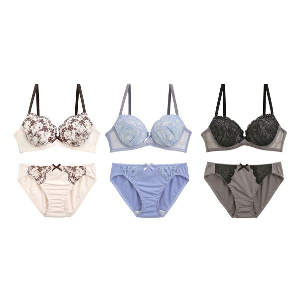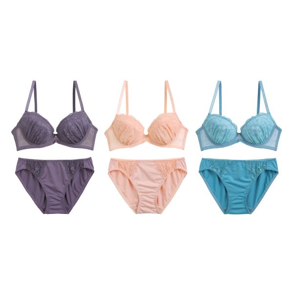 真ん中の水色のブラは、白と水色の切り替え部分のレース使いが素敵です。