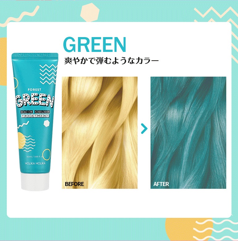 5 5eri*** 2019.12.11 タイプ:グリーン ※商品注意:黒髪でも染まりますが脱色されている髪はより鮮やかに染まります。オプション : タイプ:グリーン / ※商品注意:黒髪でも染まりますが脱色されている髪はより鮮やかに染まります。 肌タイプ : 混合肌 肌トーン : イエベ 肌の悩み : ニキビ・肌荒れ, 毛穴, くすみ・色むら, 乾燥, シミ