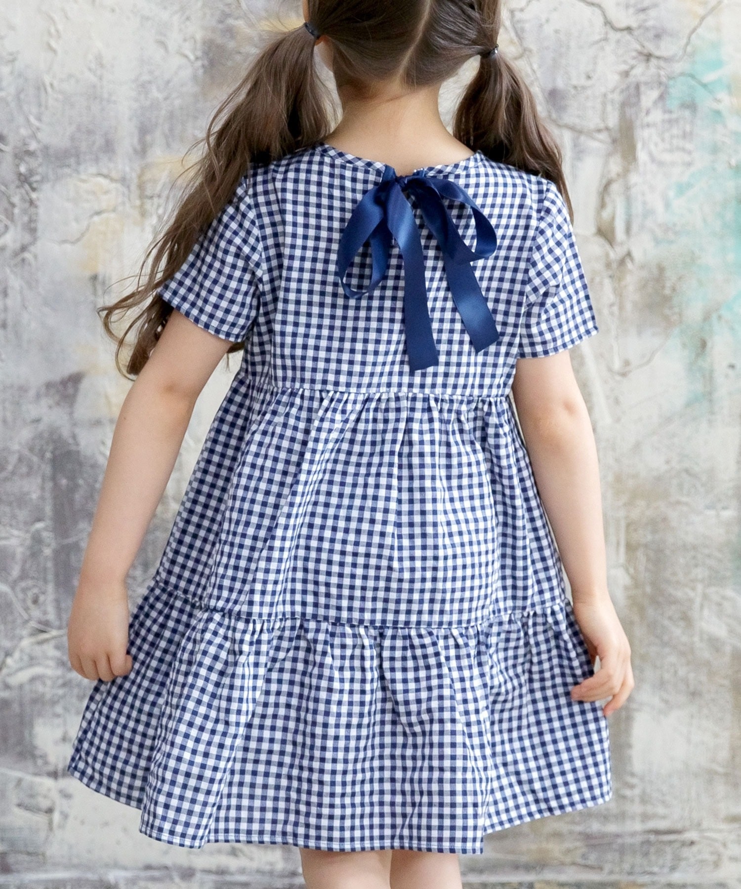 ライトブルーのギンガムチェックに、濃い青のサテンリボンが可愛いです。一目見た娘も喜んでました。着丈が膝下の長めにしたければツーサイズ上、膝〜膝上だと普段のワンサイズ上くらいのサイズ感でした。、