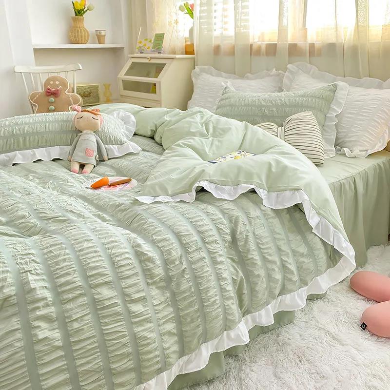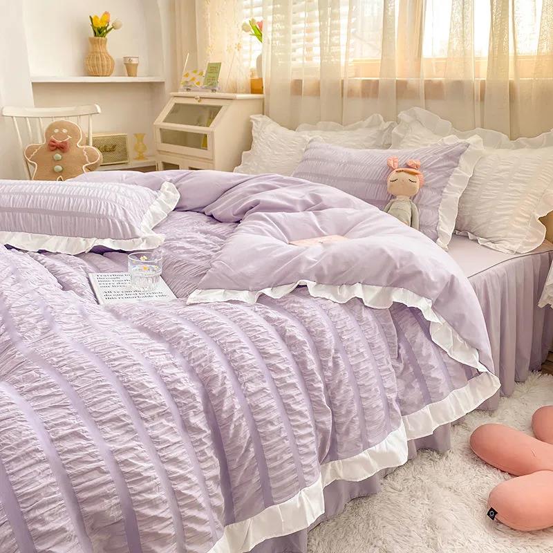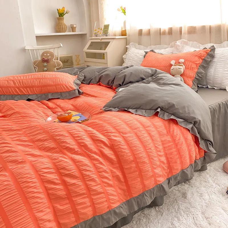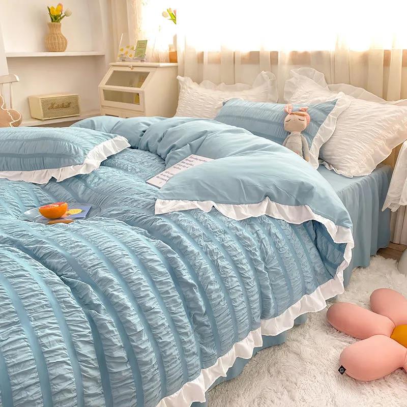 上が枕カバー、右がシーツ、ファスナーが付いているものが、掛け布団カバーです。 -