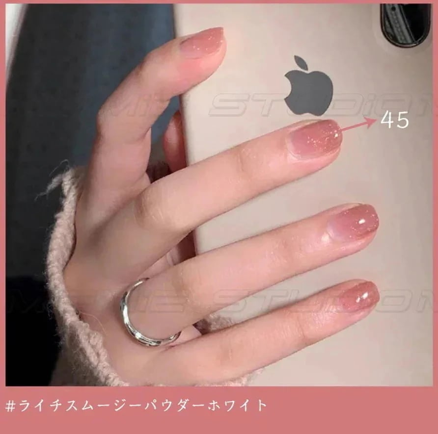 シアーなくすみピンクでかわいいです。かなりシアーです。写真2枚目のチップは、1度塗り、2度塗り、3度塗りのグラデーションになっています。自爪の色が濃いめの人は3度塗りくらいしないとはっきりとした変化が感じられないと思います。