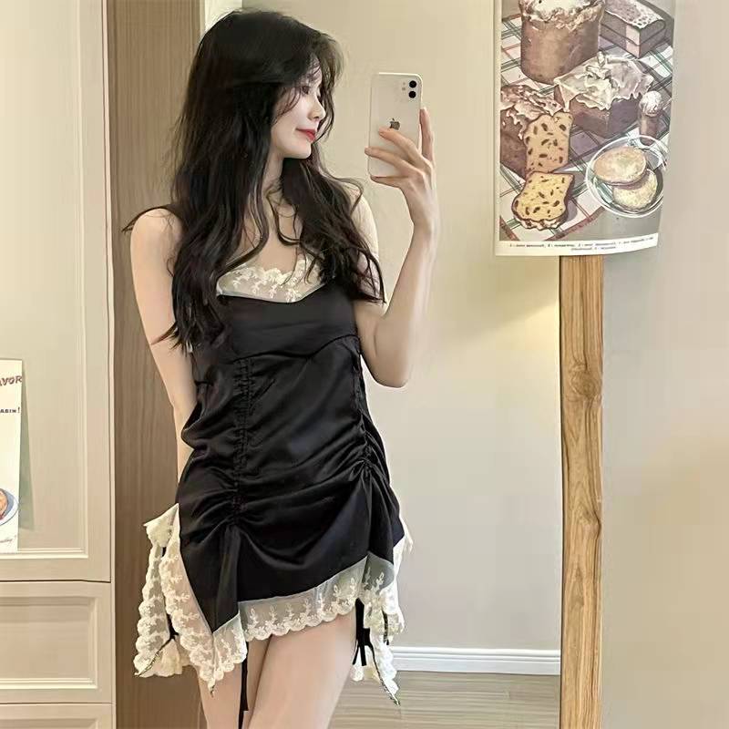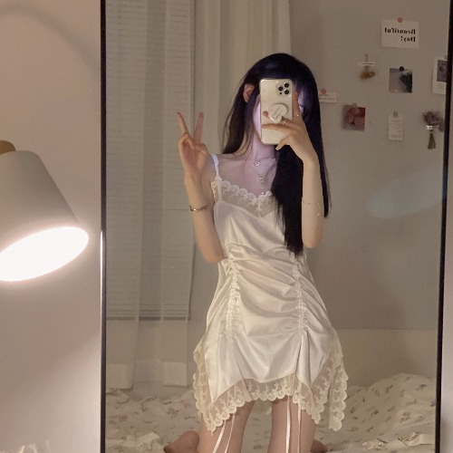 韓国系純欲少女レースはサテンのひもをつないで家で寝ているスカートのストラップワンピースをつなぎ合わせ
