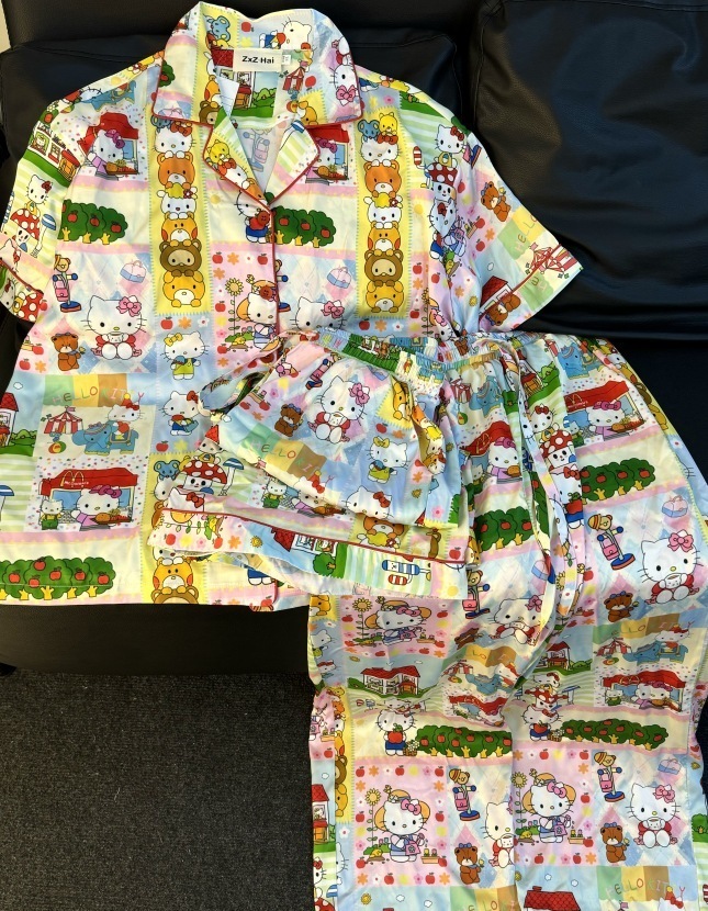 夏の落書きチェックキティ半袖短パン長ズボンアイスシルク開襟カーディガン部屋着パジャマ外着可能