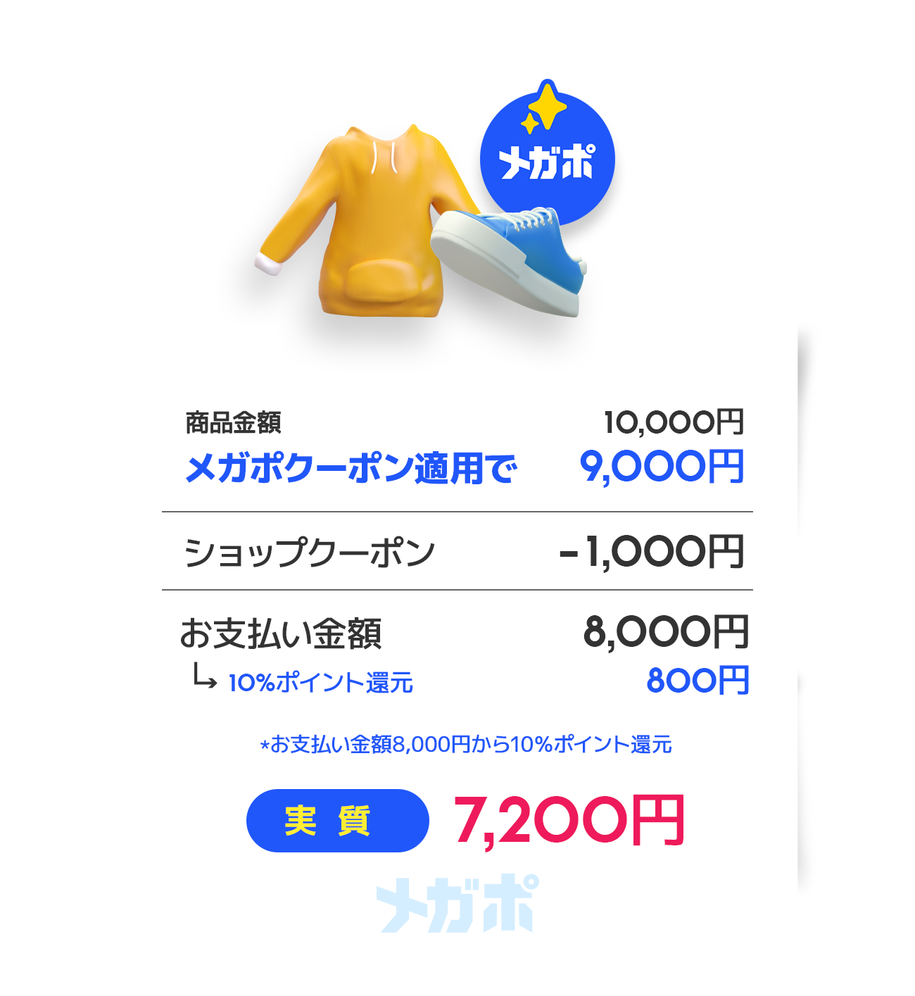 - メガポイント還元上限額 :1注文番号につき最大10,000ポイントまで還元
