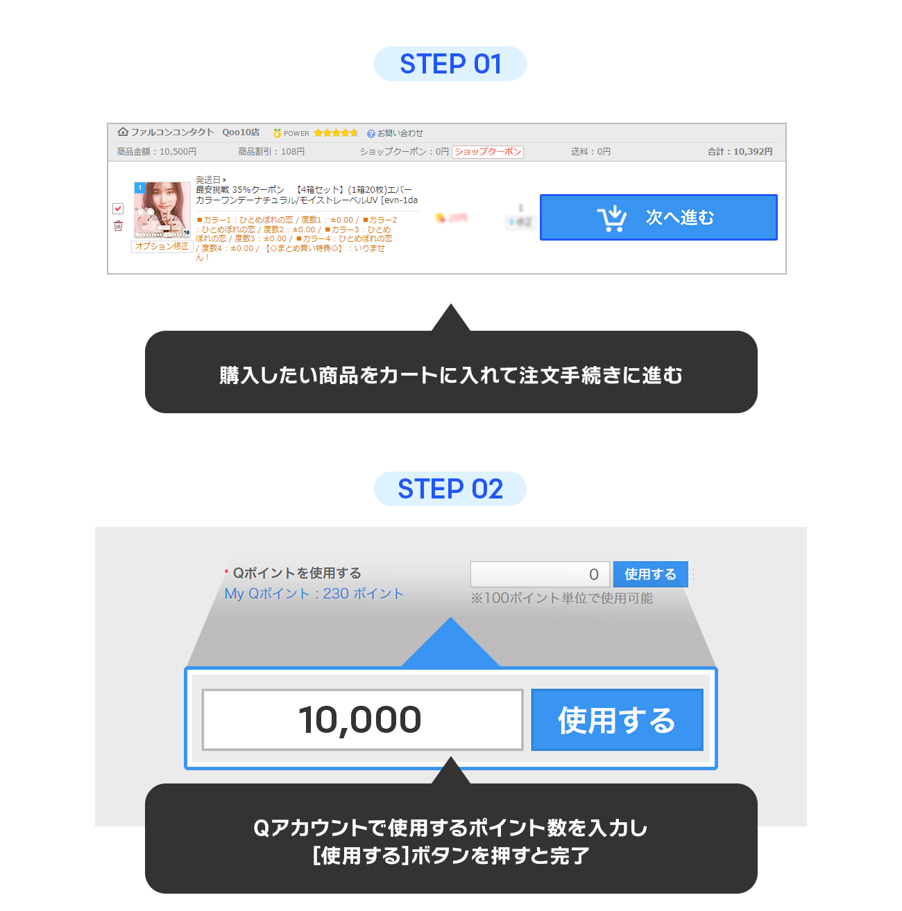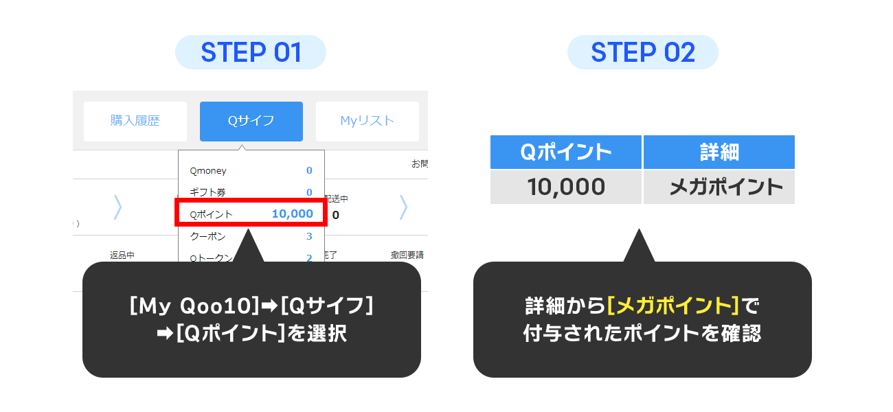 Qポイント:[My Qoo10]➡[Qアカウント]➡[Qポイント] - Qoo10サイト及びメガポページに表示される還元ポイント数と実際に還元されるポイント数が異なる場合があります。