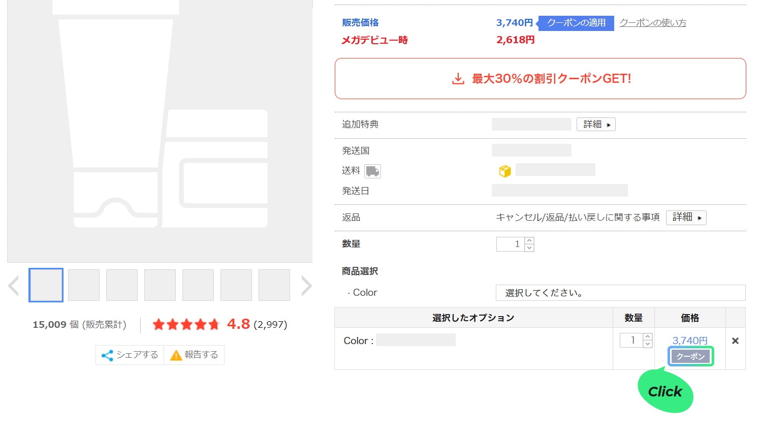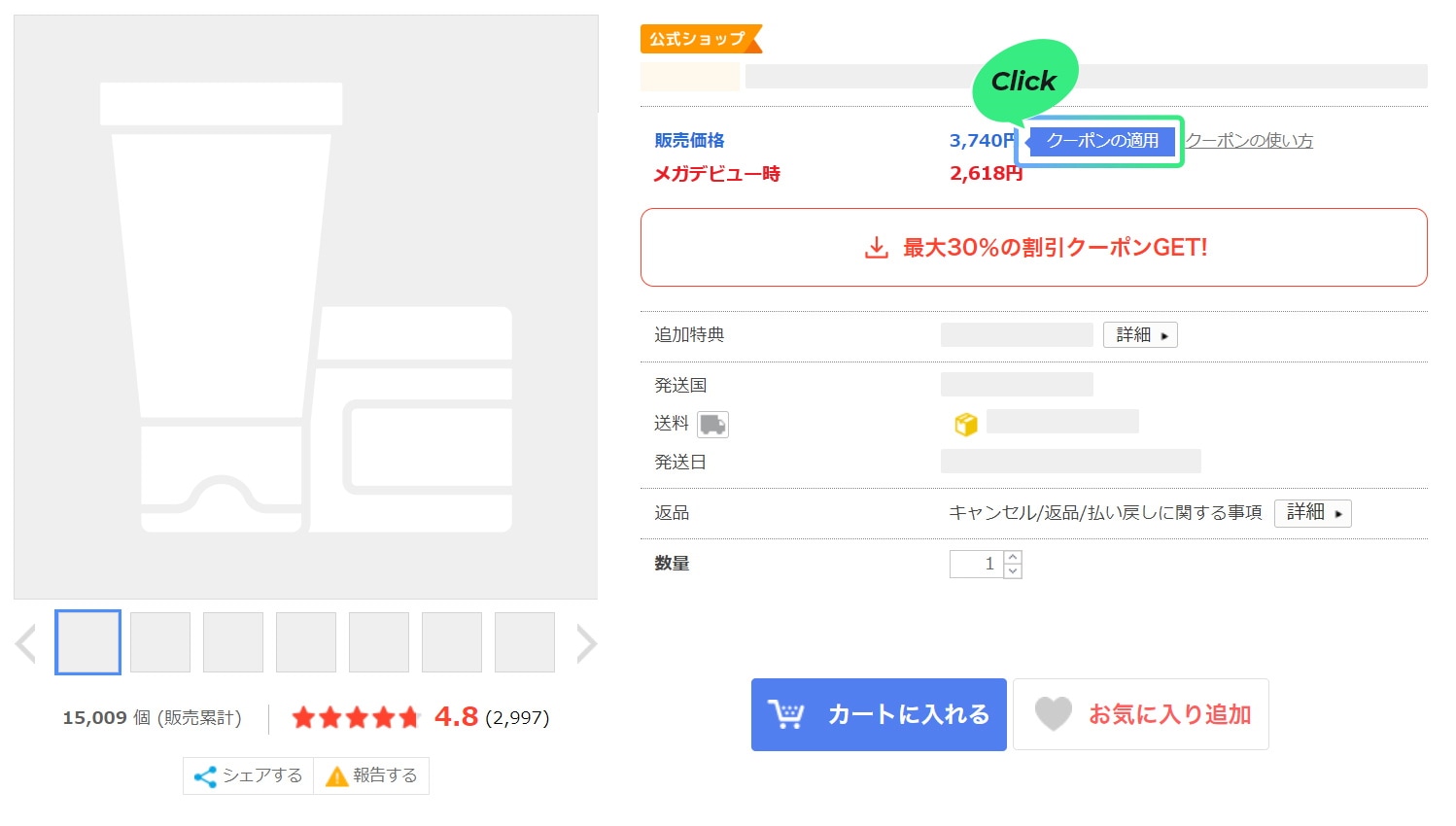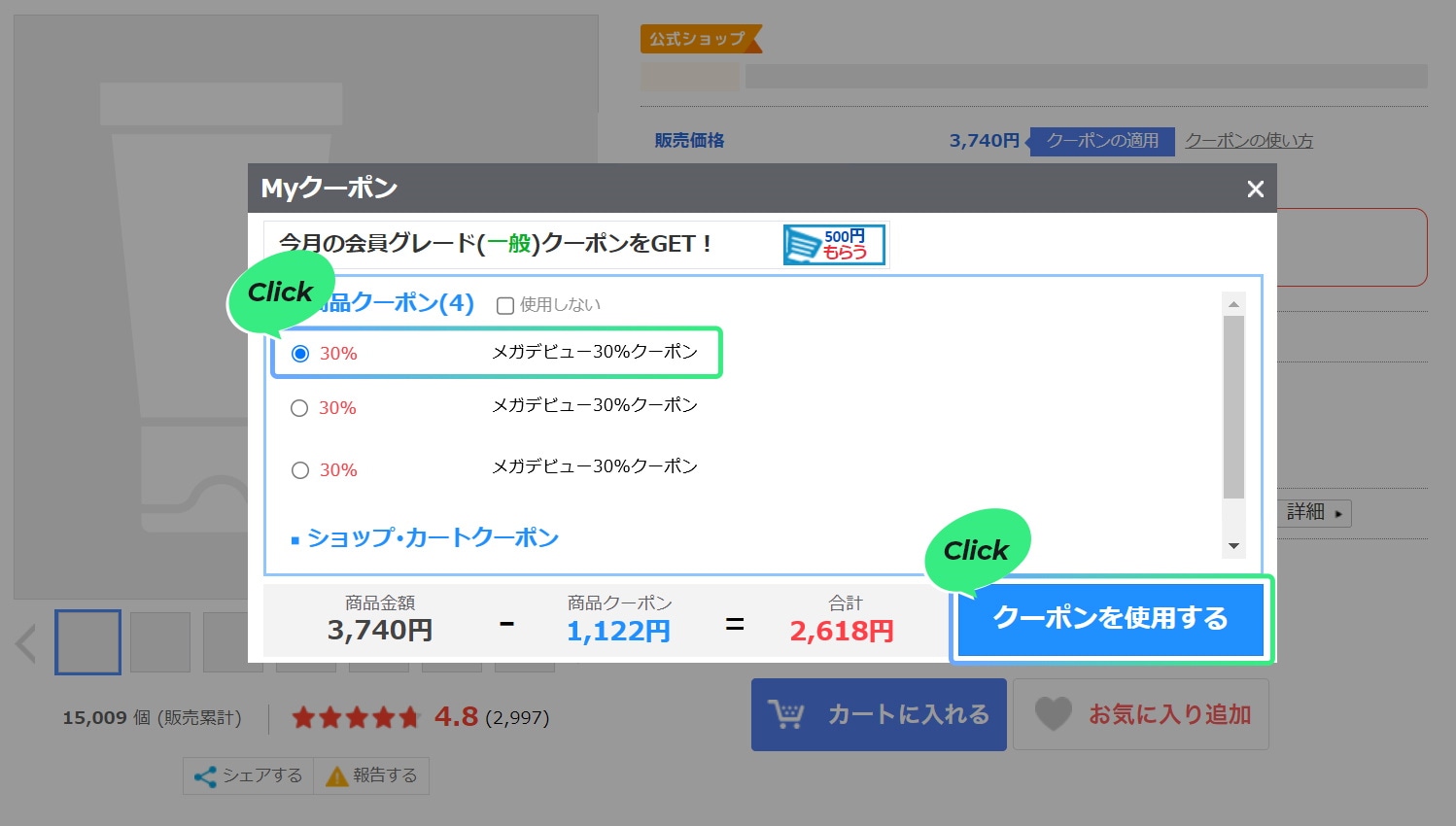 商品ページでメガデビュークーポンを選択して適用