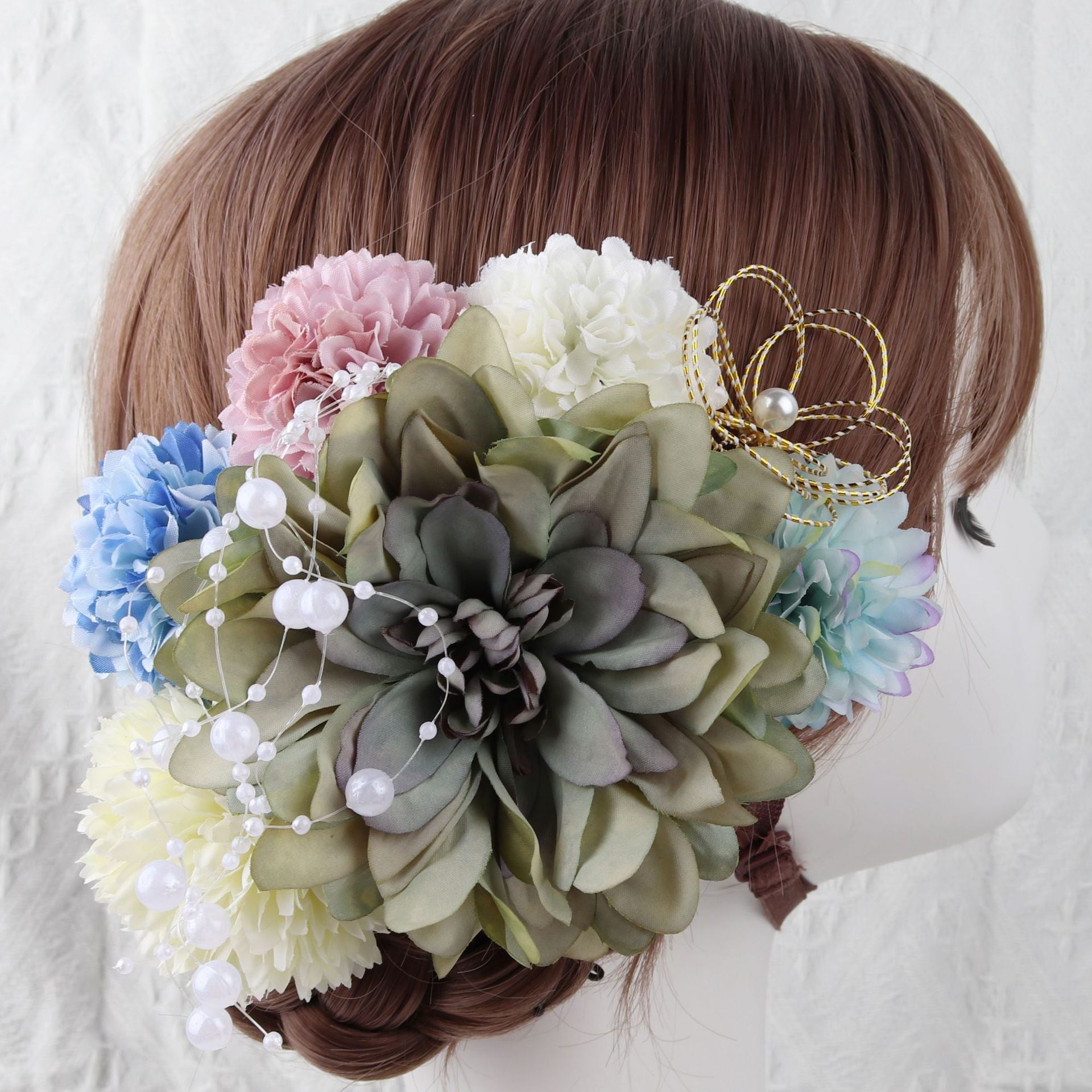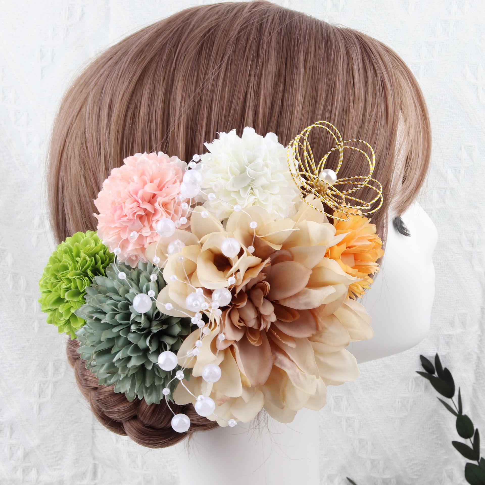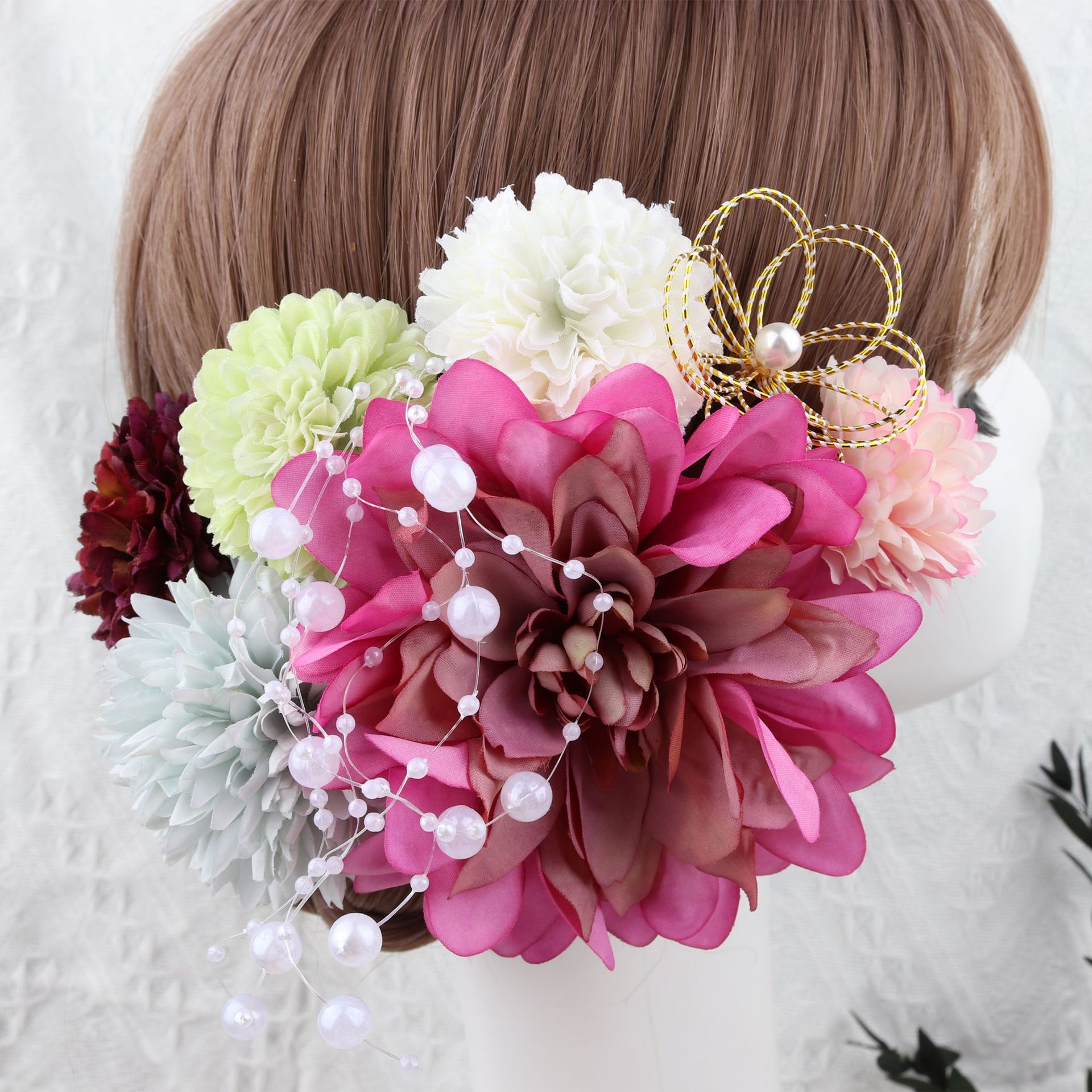 かわいい髪飾り 多色展開 夏の浴衣用 長めのビーズとフリンジ付きの大輪菊の髪飾りセット